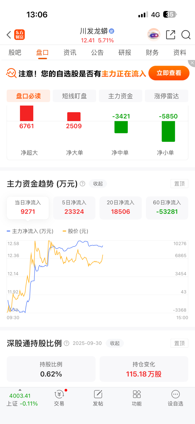 $川发龙蟒(SZ002312)$ 主力全天净流入,只有散户在做T,一会追高的也是散户,主力单日板块净流入第一,究竟在怕什么?