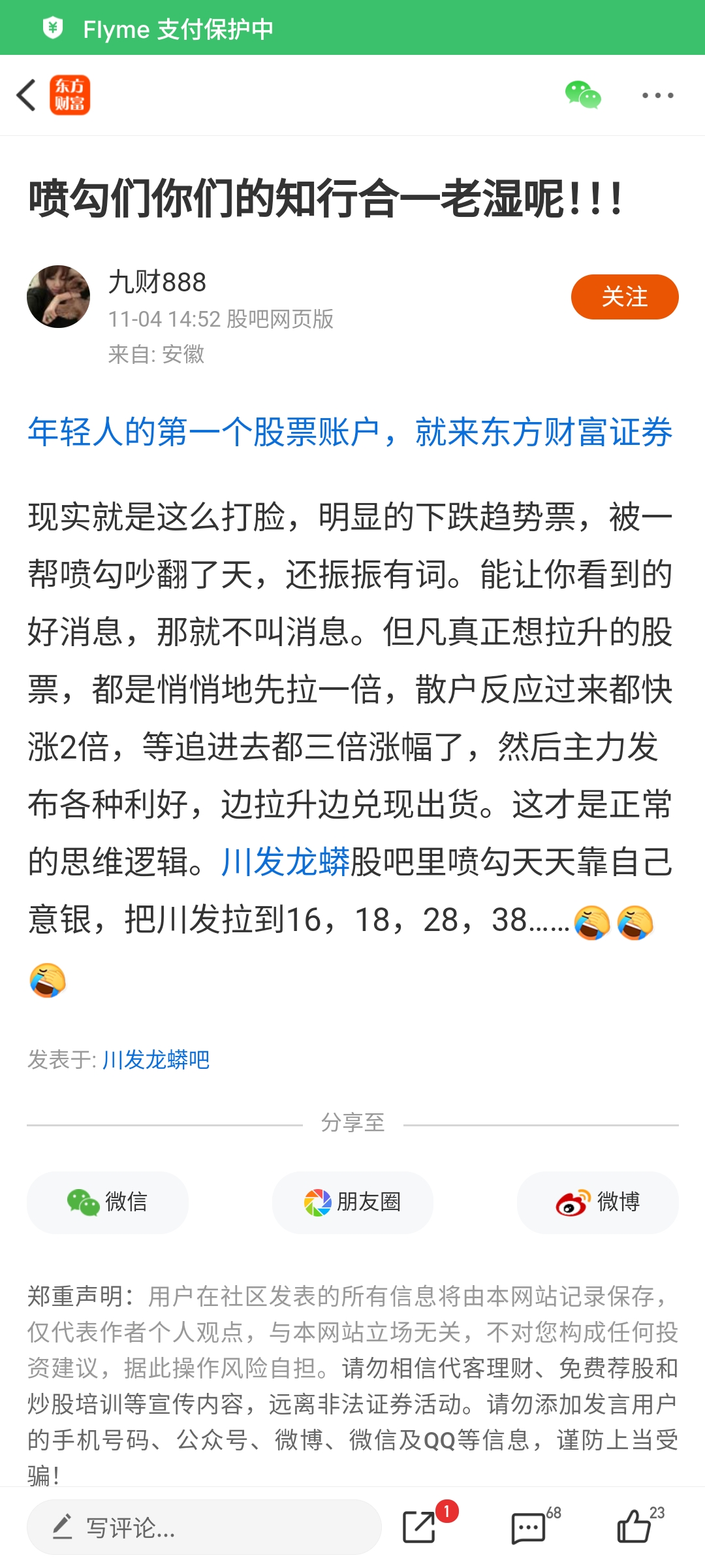 温馨提示: 1.根据《证券法》规定,禁止编造、传播虚假信息或者误导性信息,扰乱证券市场;2.用户在本社区发表的所有资料、言论等仅代表个人观点,与本网站立场无关,不对您构成任何投资建议。用户应基于自己的独立判断,自行决定证券投资并承担相应风险。《东方财富社区管理规定》