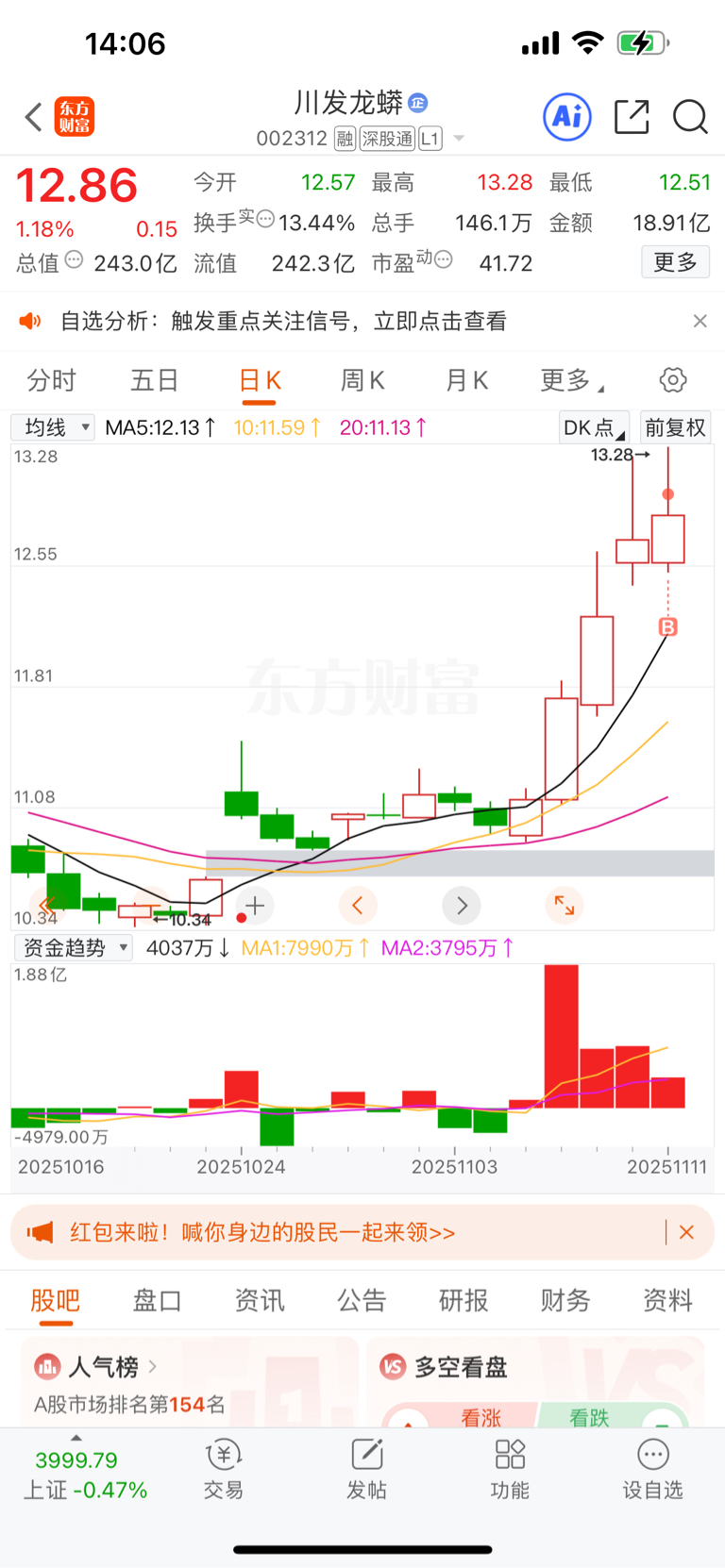 $川发龙蟒(SZ002312)$ 很不对劲这股,打一枪看看