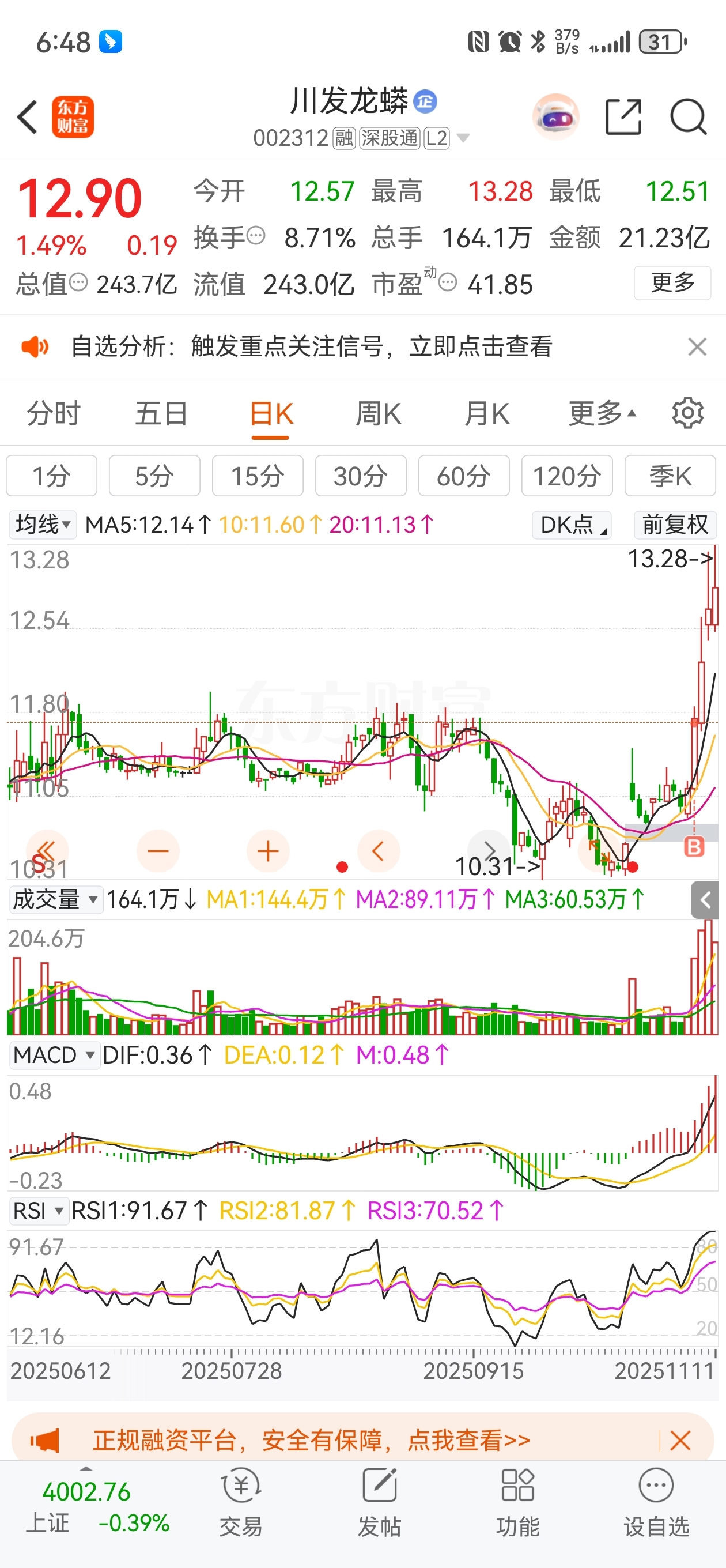 $川发龙蟒(SZ002312)$ 明天不收复天线,感觉就要中枢箱体调整了,突破进场,以前没关注这个票,不了解这个票主力操盘手法,一直格局没操作,反正只有三层,如果是中枢调整,就静待三买再补点仓
