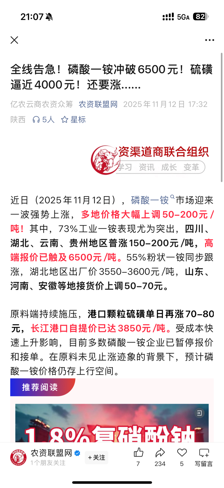 磷酸一铵6500了,龙蟒一铵利润20%蹲,是利润的主要来源,且硫磺为自产自用、成