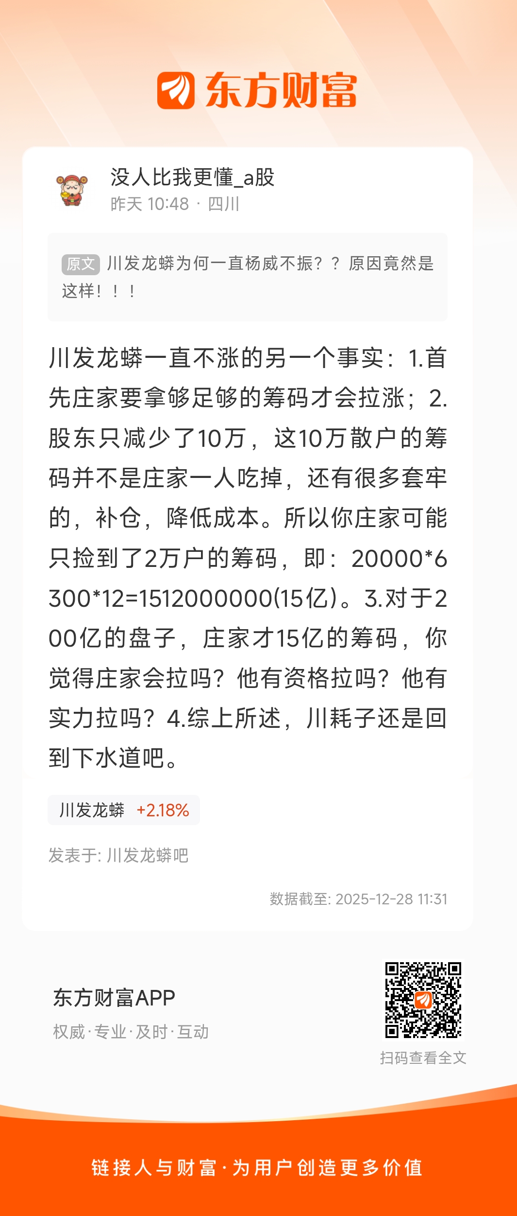 完蛋了,人气上升这么高,有很多散户要来抢筹码了,这川发的耗子主力这下得待到下水道,不敢出来了。//@没人比我更懂_a股 :川发龙蟒一直不涨的另一个事实:1.首先庄家要拿够足够的筹码才会拉涨;2.股东只减少了10万,这10万散户的筹码并不是庄家一人吃掉,还有很多套牢的,补仓,降低成本。所以你庄家可能只捡到了2万户的筹码,即:20000*6300*12=1512000000(15亿)。3.对于200亿的盘子,庄家才15亿的筹码,你觉得庄家会拉吗?他有资格拉吗?他有实力拉吗?4.综上所述,川耗子还是回到下水道吧。