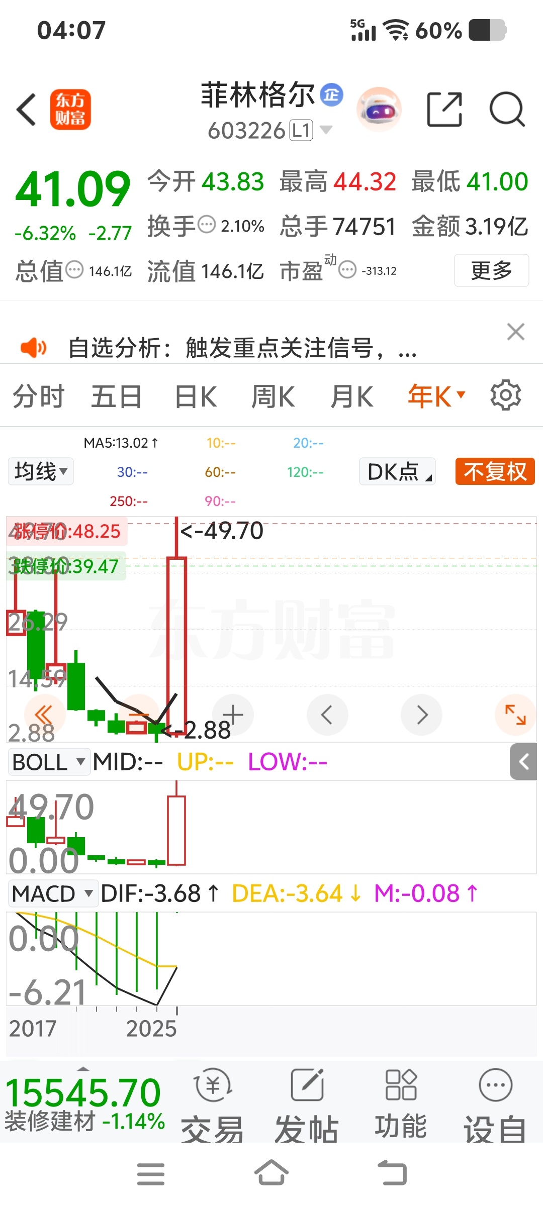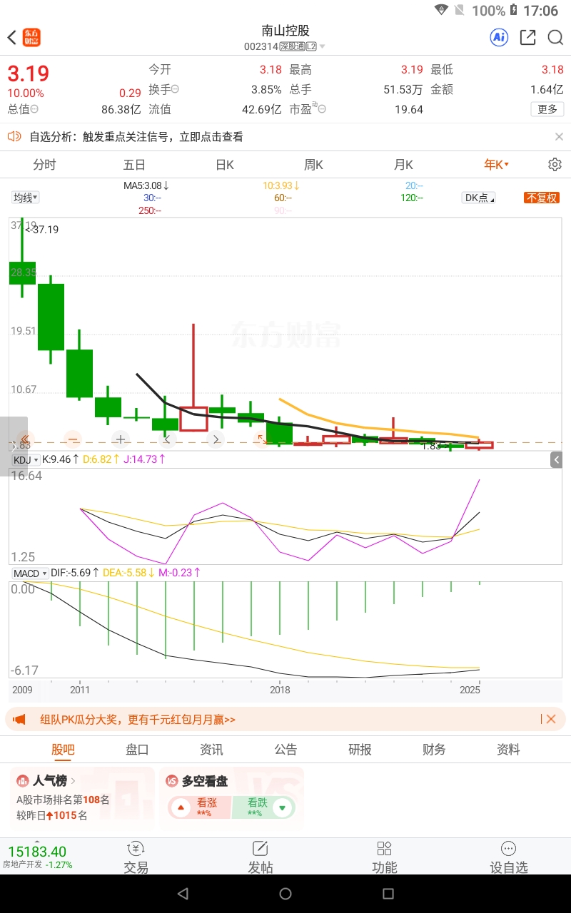 形势大好,暖风频吹,季报节节高,年报基本也会较好!以三季报为契机,年线级别行情终于开启。此股没有融资融券,人气低迷时,难涨难跌,人气高涨时,没有融券做空,易涨难跌。亏损股菲林格尔就是没有融资融券的妖股,妙高
