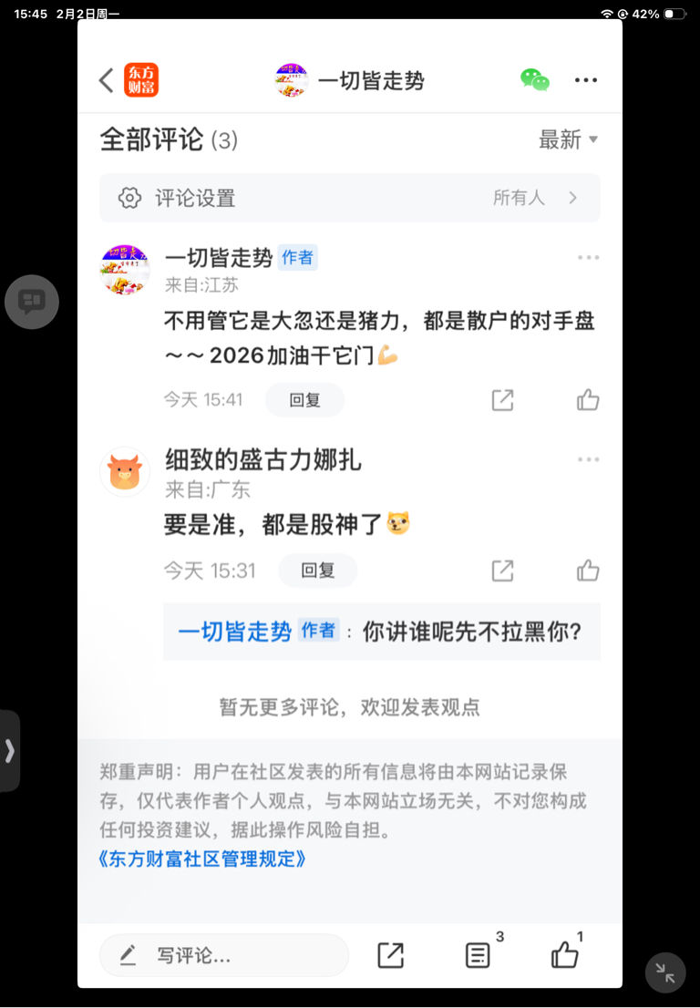 温馨提示: 1.根据《证券法》规定,禁止编造、传播虚假信息或者误导性信息,扰乱证券市场;2.用户在本社区发表的所有资料、言论等仅代表个人观点,与本网站立场无关,不对您构成任何投资建议。用户应基于自己的独立判断,自行决定证券投资并承担相应风险。《东方财富社区管理规定》