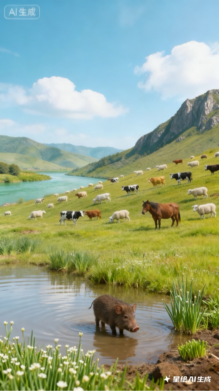 群马踏云风送爽,众牛饮涧波摇玉。