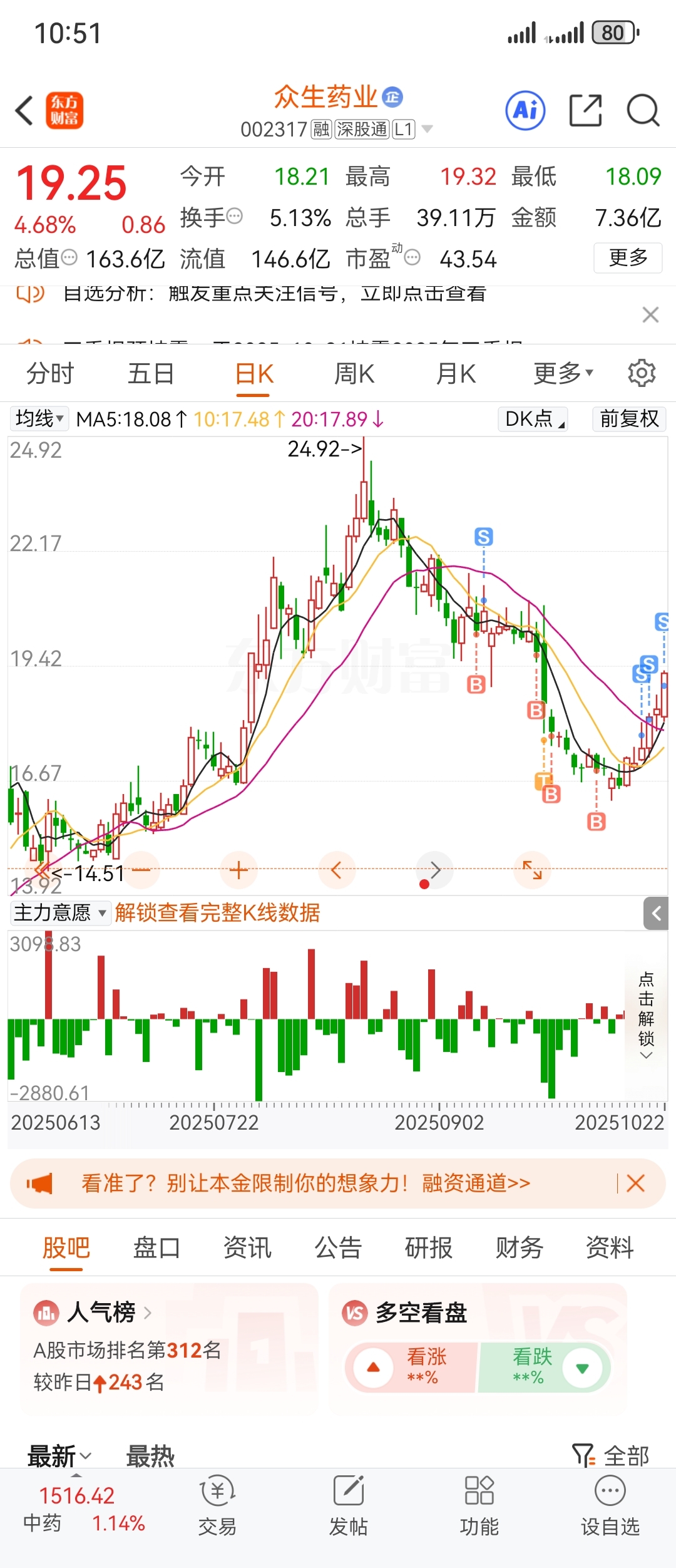 $众生药业(SZ002317)$ 唉,总是一点蝇头小利就卖掉了