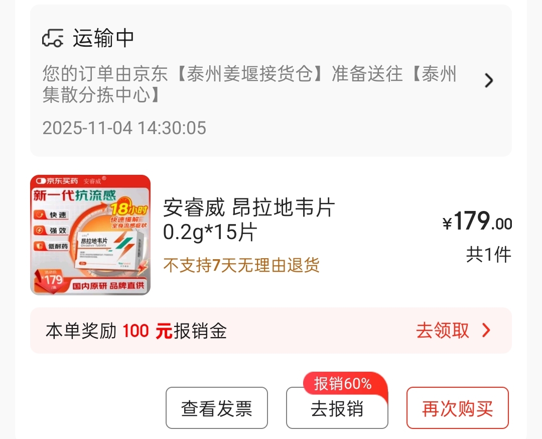 $众生药业(SZ002317)$ 直接就近发货,推测 昂拉地韦片已经在京东仓库全国铺货了。国谈价格估计也在179左右。每盒利润超百元,一个流感季卖3000万盒应该没问题。