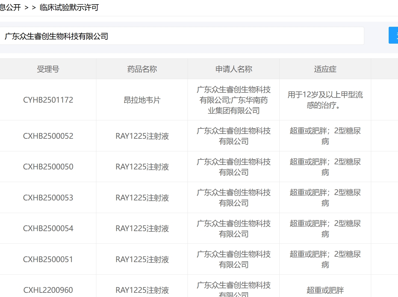 CXHB2500052 | RAY1225注射液 | 广东众生睿创生物科技有限公司 | 超重或肥胖;2型糖尿病 |