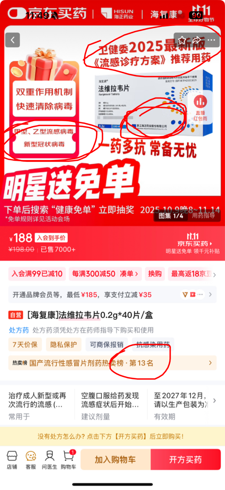 法维拉韦:海正药业,188元/盒,排名第13(甲乙流)。