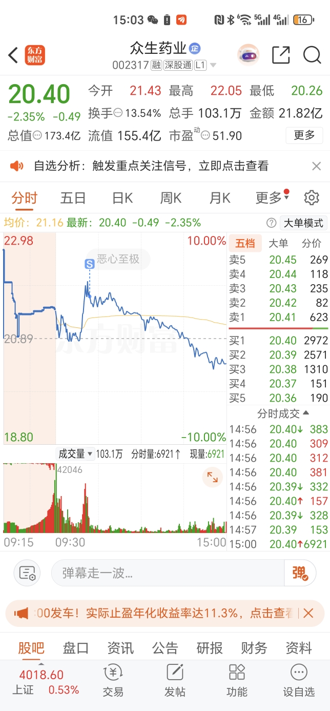 $众生药业(SZ002317)$ 22块刚好接了个电话没跑成,今天大盘这么好,资金都去别的板块了,铁定是出货,还好清仓了!