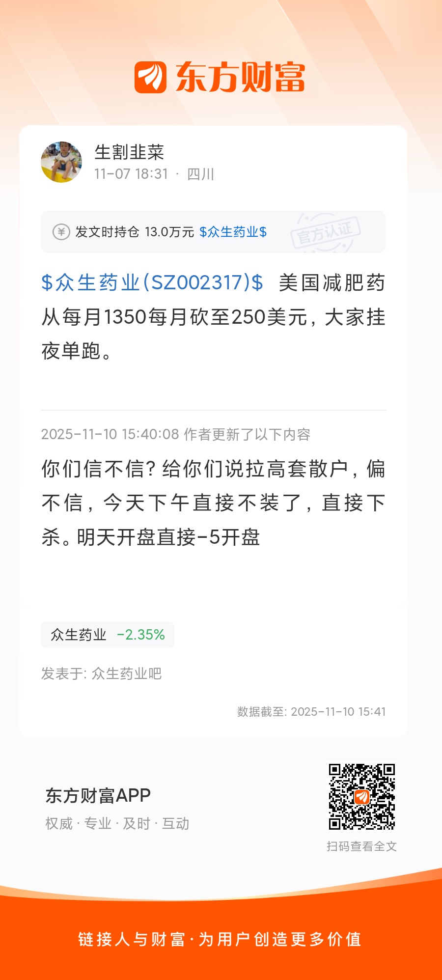 $众生药业(SZ002317)$  美国减肥药从每月1350每月砍至250美元,大家挂夜单跑。