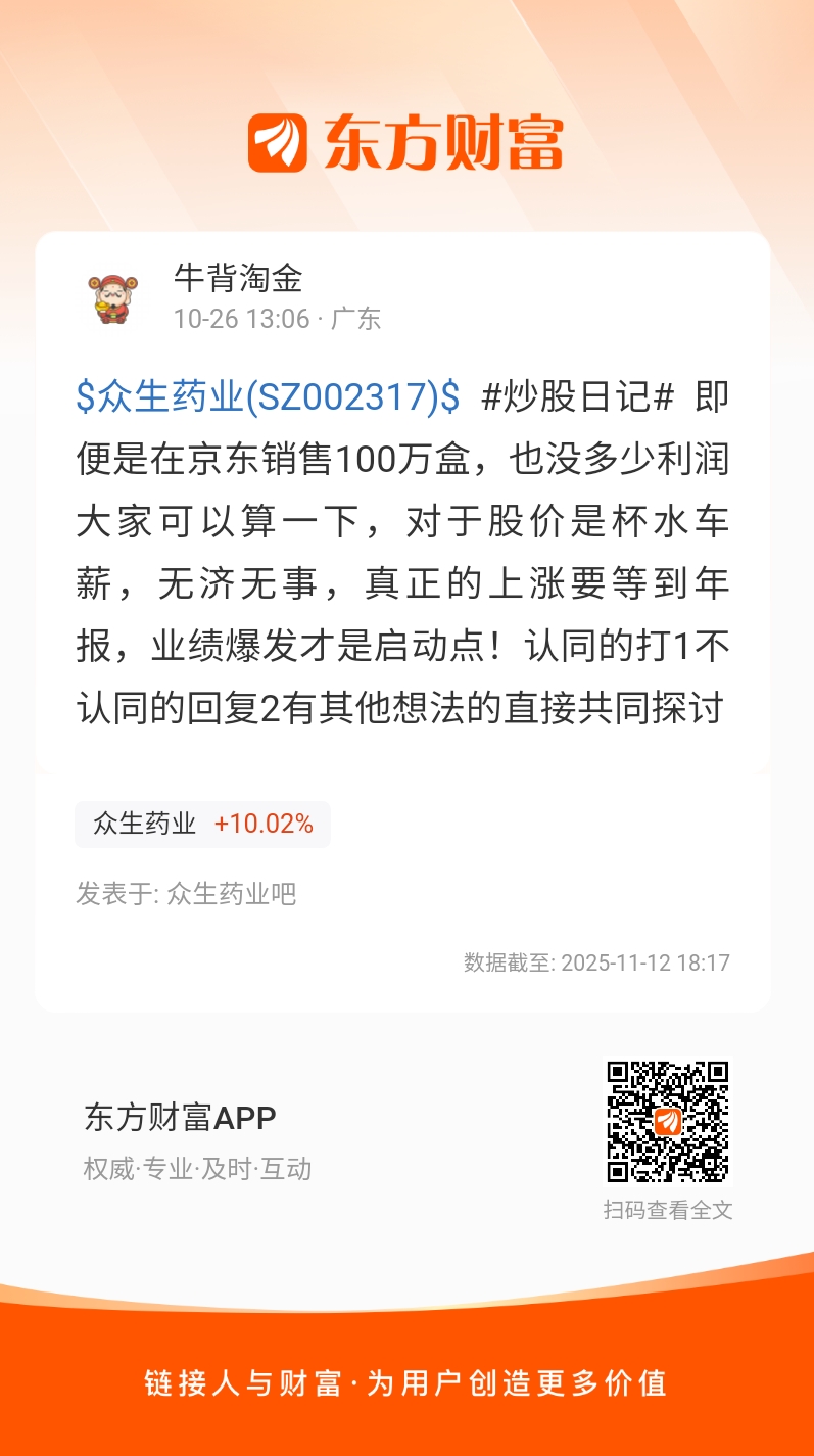 $众生药业(SZ002317)$ #炒股日记# 即便是在京东销售100万盒,也没多少利润大家可以算一下,对于股价是杯水车薪,无济无事,真正的上涨要等到年报,业绩爆发才是启动点!认同的打1不认同的回复2有其他想法的直接共同探讨