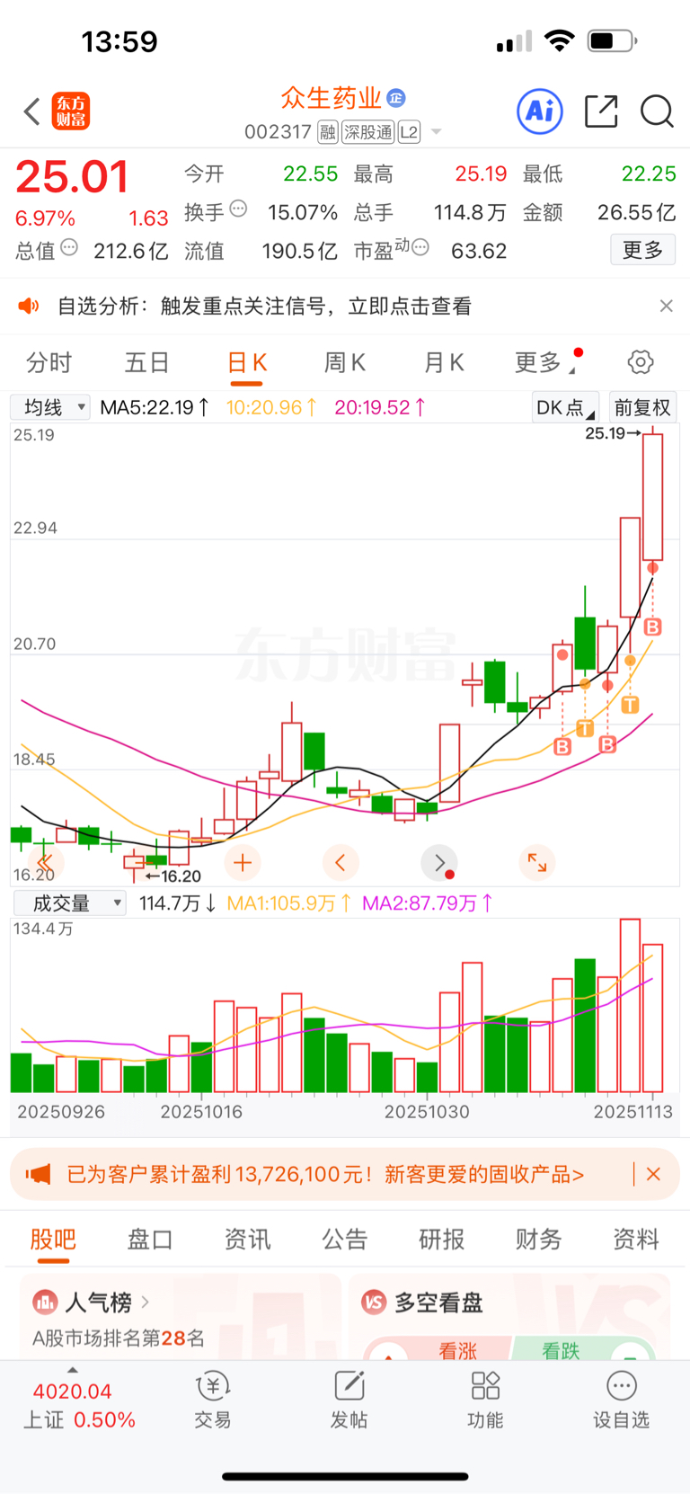 $众生药业(SZ002317)$ 芜湖 好股 感谢主力 最近t爽了