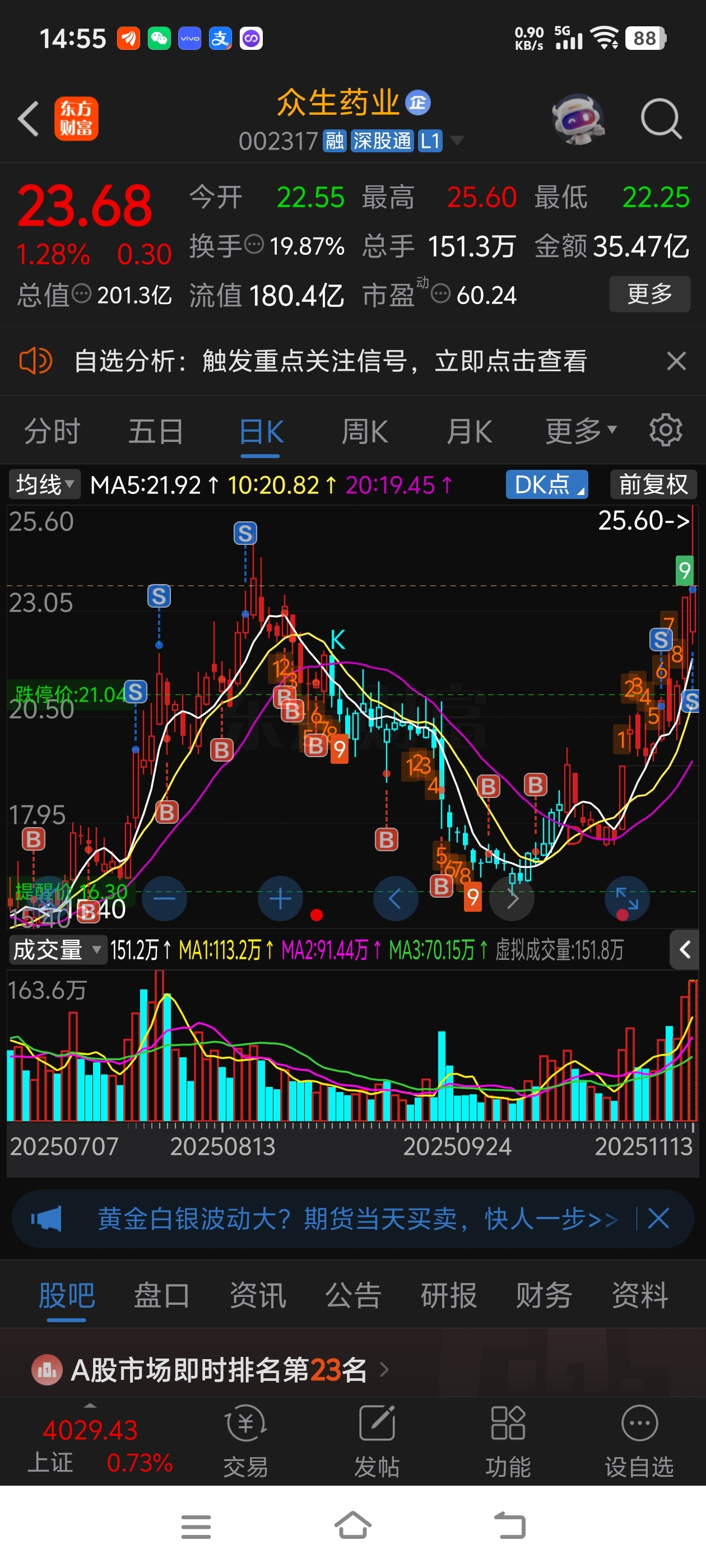 $众生药业(SZ002317)$ 今天从涨9.5个点到回落到1个多点,留下了超级长的上影线,跑路了,留下的兄弟们继续吃肉。