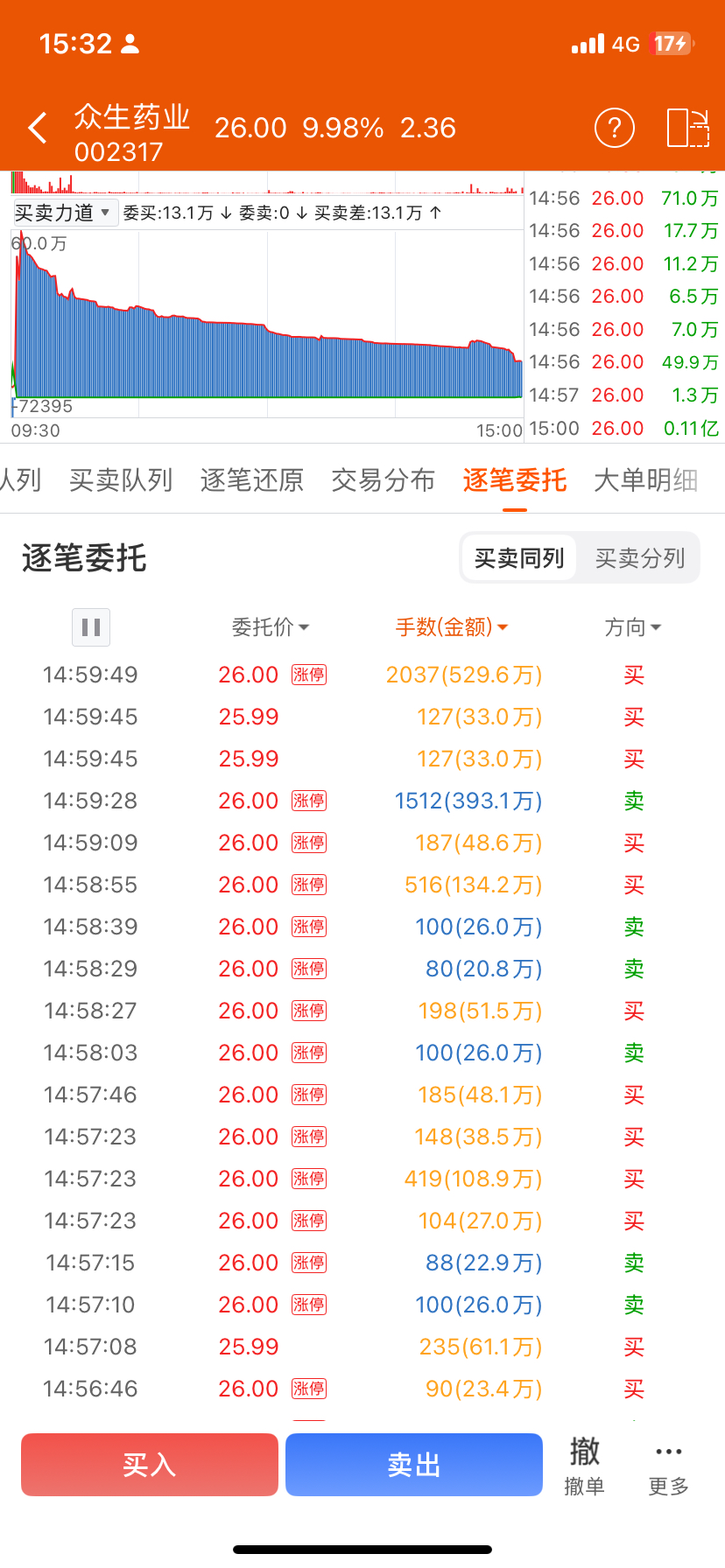 $众生药业(SZ002317)$ 竞价没有大卖单,安全