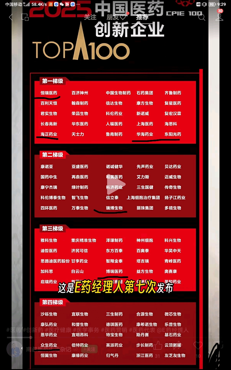 2025年医药企业创新100强出炉第一梯队的恒瑞医药海正药业东阳光华海药业的市值