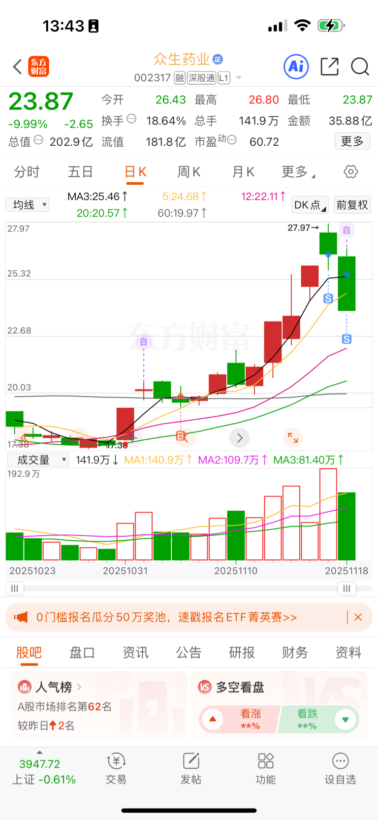 $众生药业(SZ002317)$ 昨天还对他抱有希望,所以出了一半,今天出完了。
