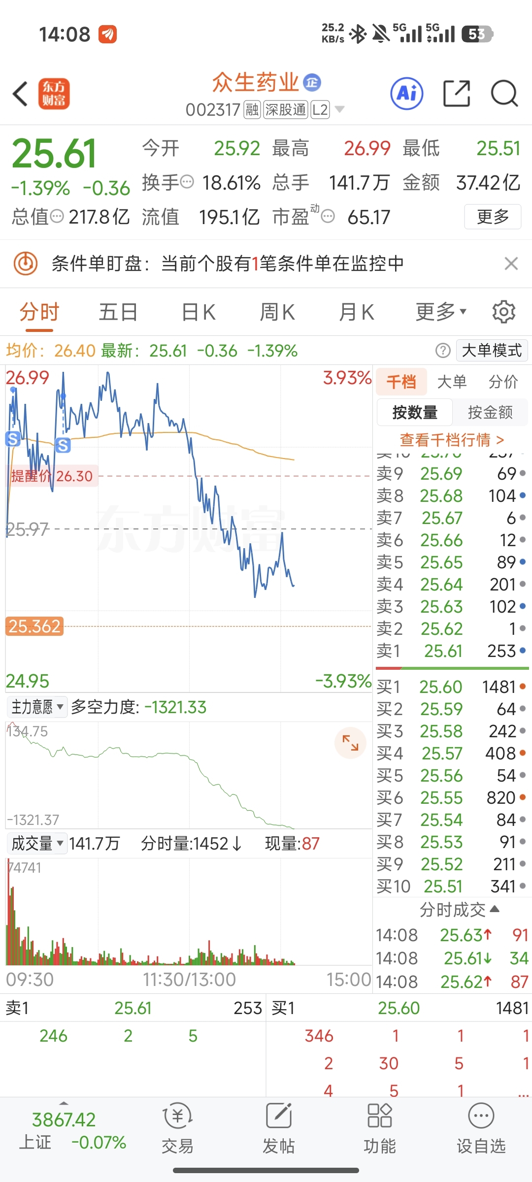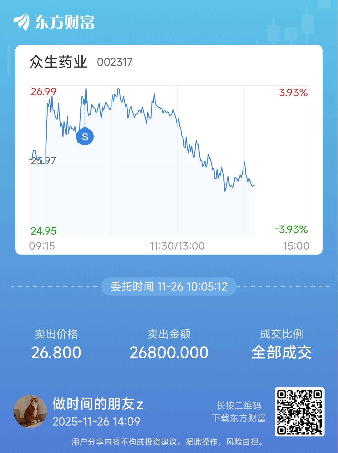 委托标的:众生药业买卖方向:卖笔记:幸亏早上分批卖了大部分,不然下午又绿了,a股