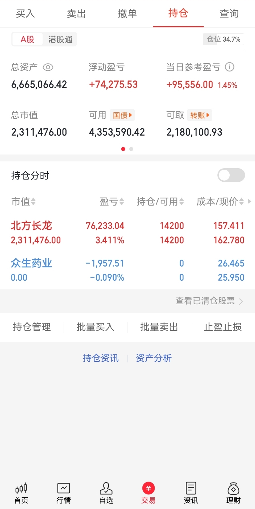 周哥早盘记录仓位北方长龙早盘冲高没有走,V回来三个多点差不多回本走了我还在拿着,