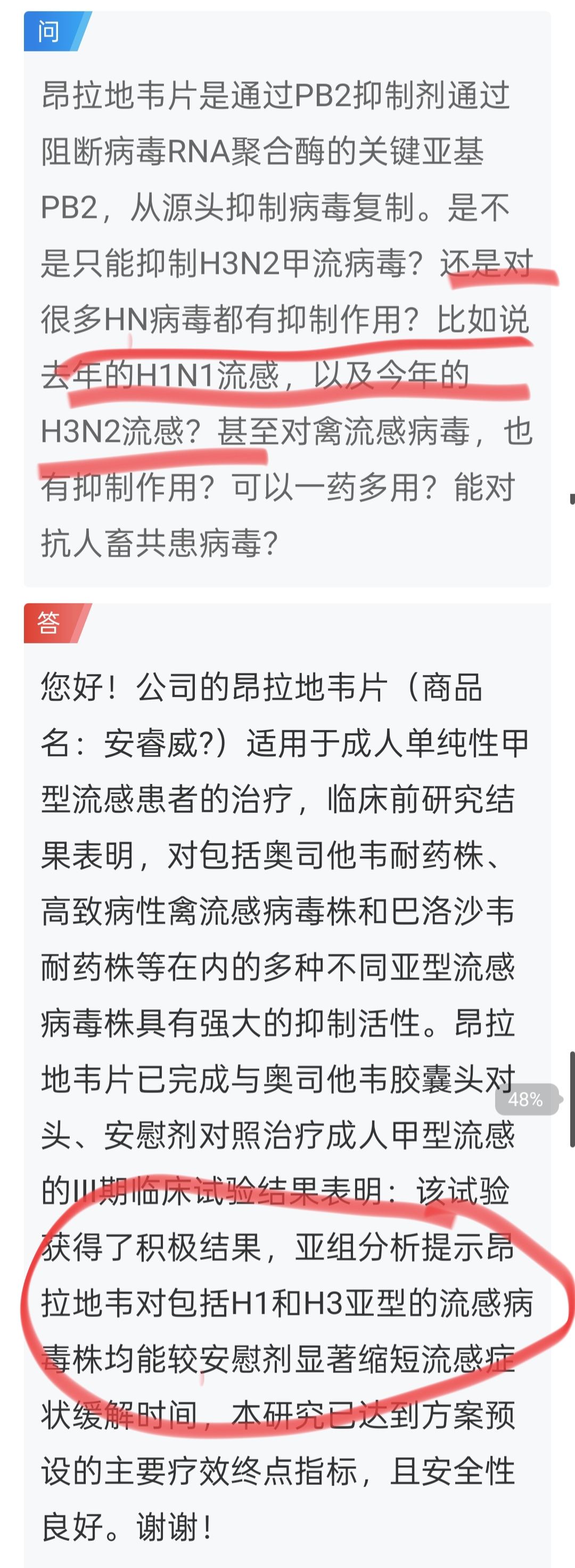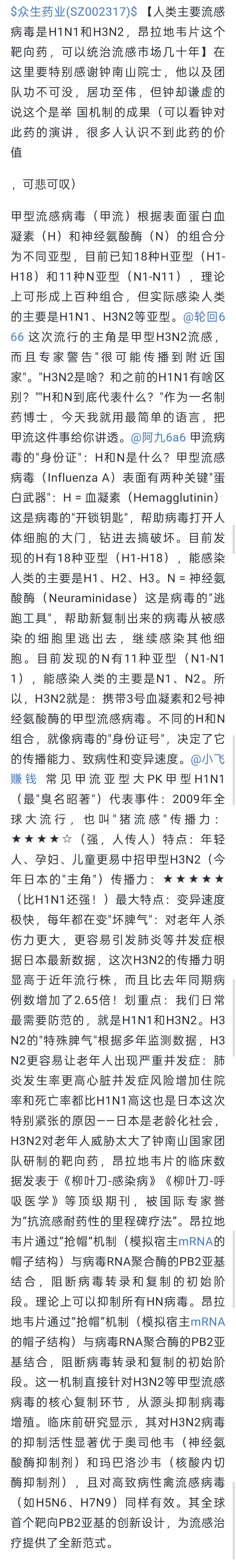 $众生药业(SZ002317)$ 人类目前最主要的流感就是H1N1和H3N2,昂拉地韦片不但对这个两个流感有明显效果。还对所有H1型,H3型流感均有明显效果。这个昂拉地韦片可以统治流感市场用药至少20年以上,除非超级新病毒出现!