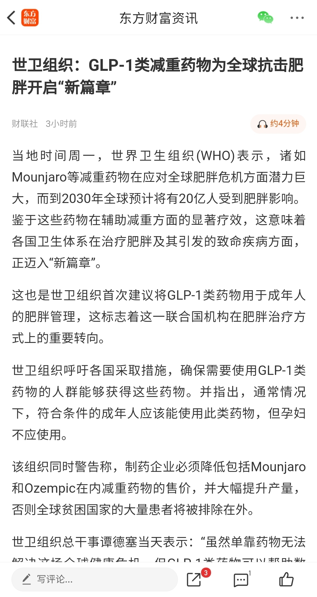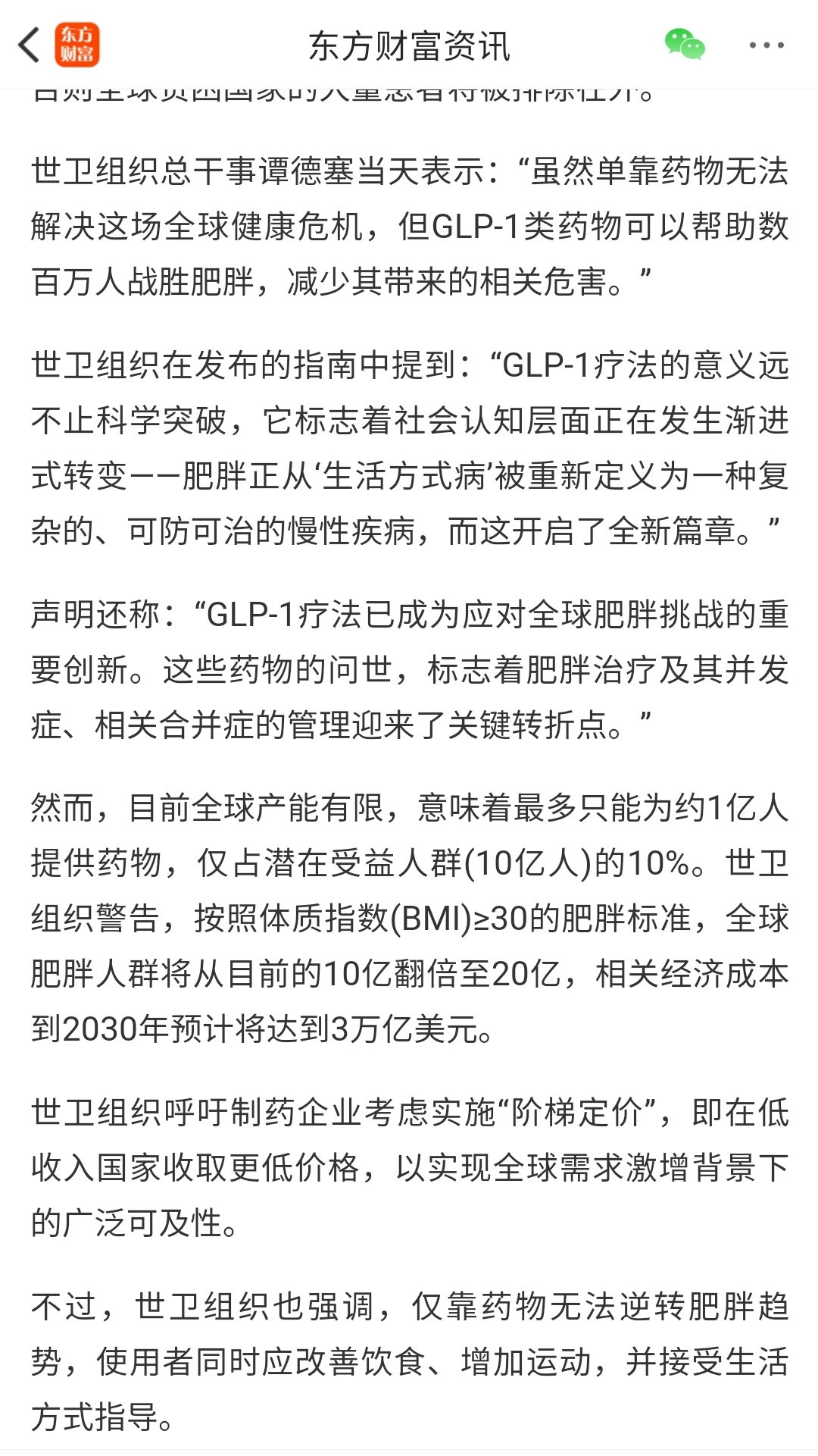 $众生药业(SZ002317)$ 刚刚12月1日晚,世卫组织首次建议把GLP–1类药物用于成年人的肥胖管理。世卫组织呼吁各国采取措施,确保需要使用GLP–1的类药物的人群能够获得这些药物。