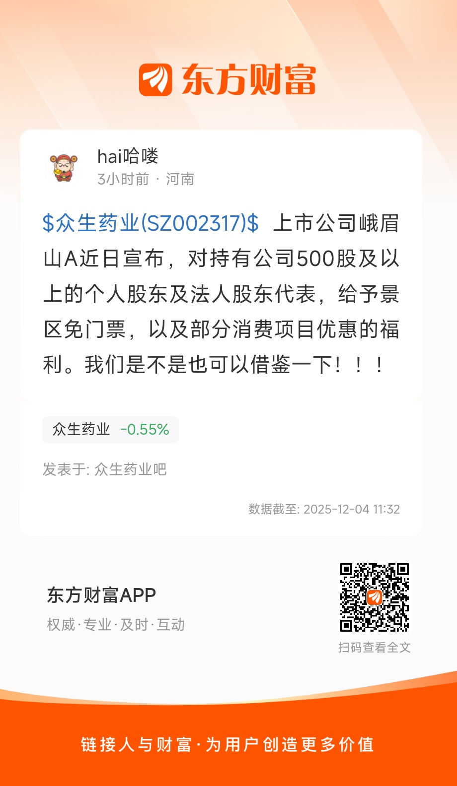$众生药业(SZ002317)$ 上市公司峨眉山A近日宣布,对持有公司500股及以上的个人股东及法人股东代表,给予景区免门票,以及部分消费项目优惠的福利。我们是不是也可以借鉴一下!!!
