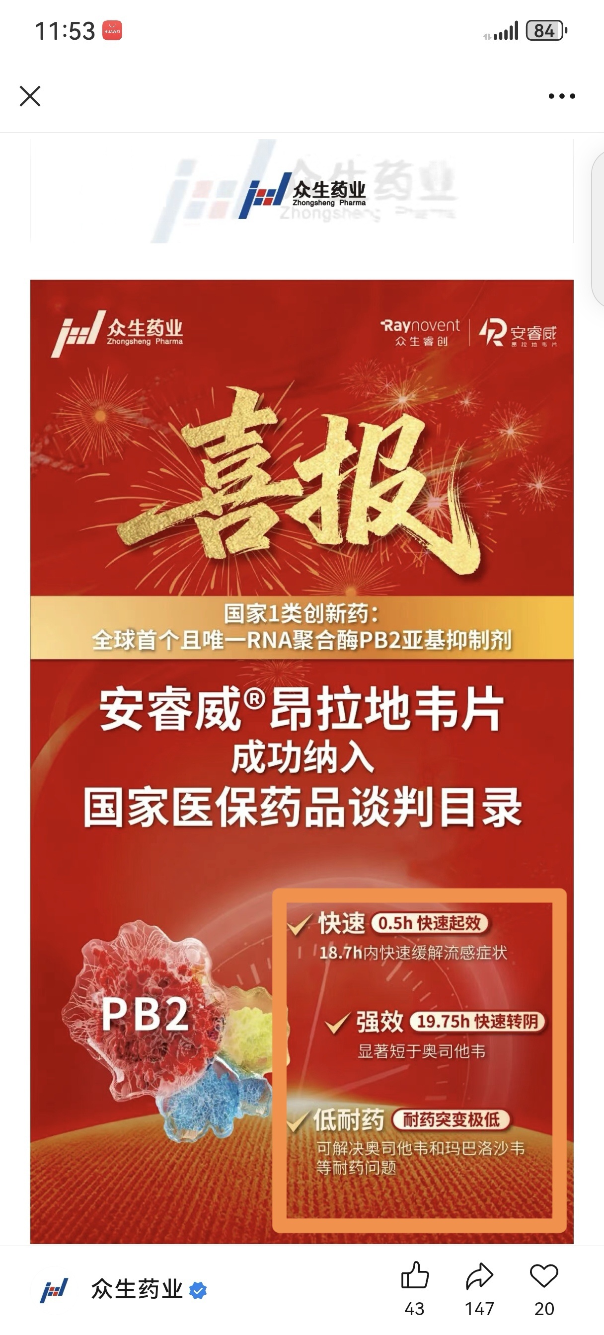$众生药业(SZ002317)$ 入医保后,昂拉地韦的销售渠道就不需要公司自己去大力推广,每年广告费也会节省一大笔。还能依靠医保的销售渠道去全国各地三甲等大型医院和农村医保合作医院铺货销售。价格也会更加惠民。