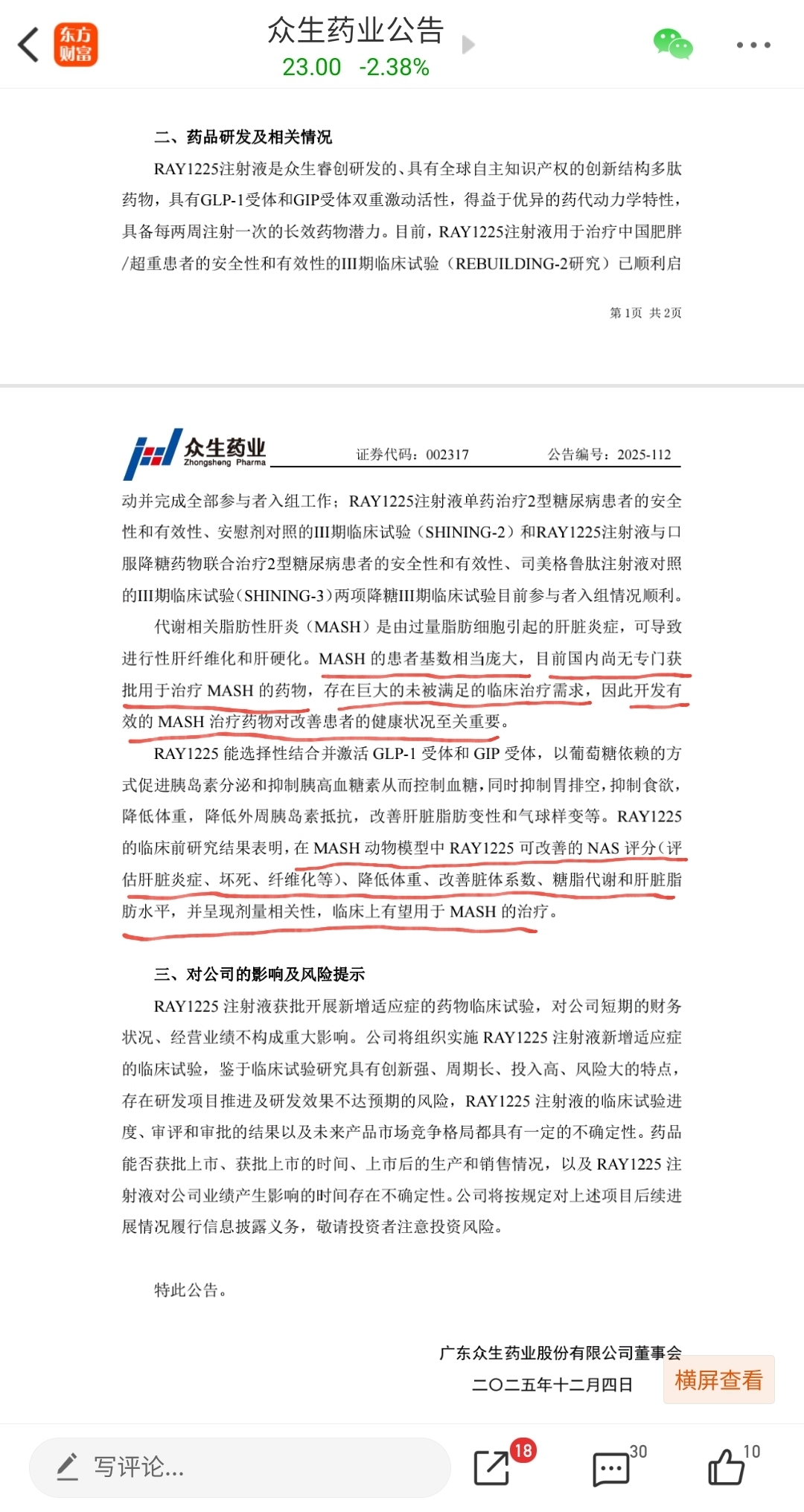 1、MASH的患者基数相当庞大。我来给翻译一下,MASH的患病比例占全球总人口数的4%,脂肪肝的患病比例占全球总人口数的32%,能治MASH就能治脂肪肝。美国肥胖率超过70%,肥胖是全球治疗领域最庞大的市场,能治疗脂肪肝就能治疗肥胖。也就是说RAY1225的潜在受众群体大约在30亿人左右。这也是为何礼来单靠一种药替尔泊肽就能撑起万亿美元市值的原因。众生药业的RAY1225效果甚至比替尔泊肽还要好一些,礼来万亿美元市值,众生未来卖便宜点,抢个1%的市场总该行吧?