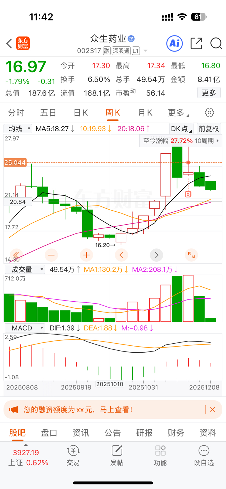 $众生药业(SZ002317)$ 够跌,还在半空中