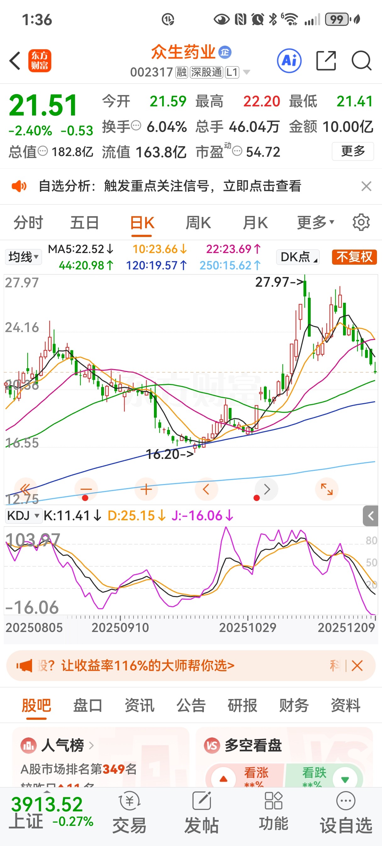 KDJ超卖往往是短期情绪触底的信号,结合公司估值(动态市盈率54.72倍)处于行业合理区间,当前股价回调或已消化利空因素。对于关注医药赛道的投资者而言,众生药业短期超卖带来的价格洼地,或为逢低布局的窗口,后续可重点关注股价能否在均线支撑位企稳,以及量能能否同步回暖。