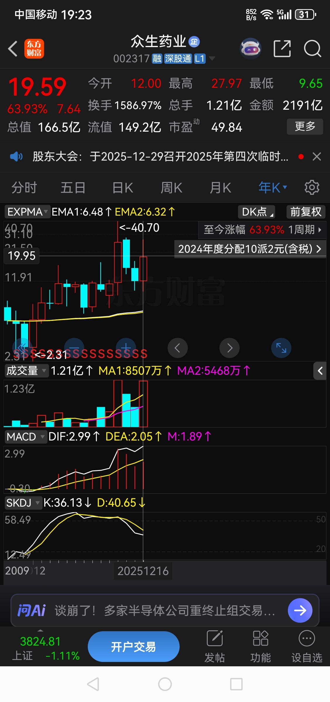$众生药业(SZ002317)$ 49倍,还要近五十年赚的钱才够19.59。便宜啊,大家多买点多补点!