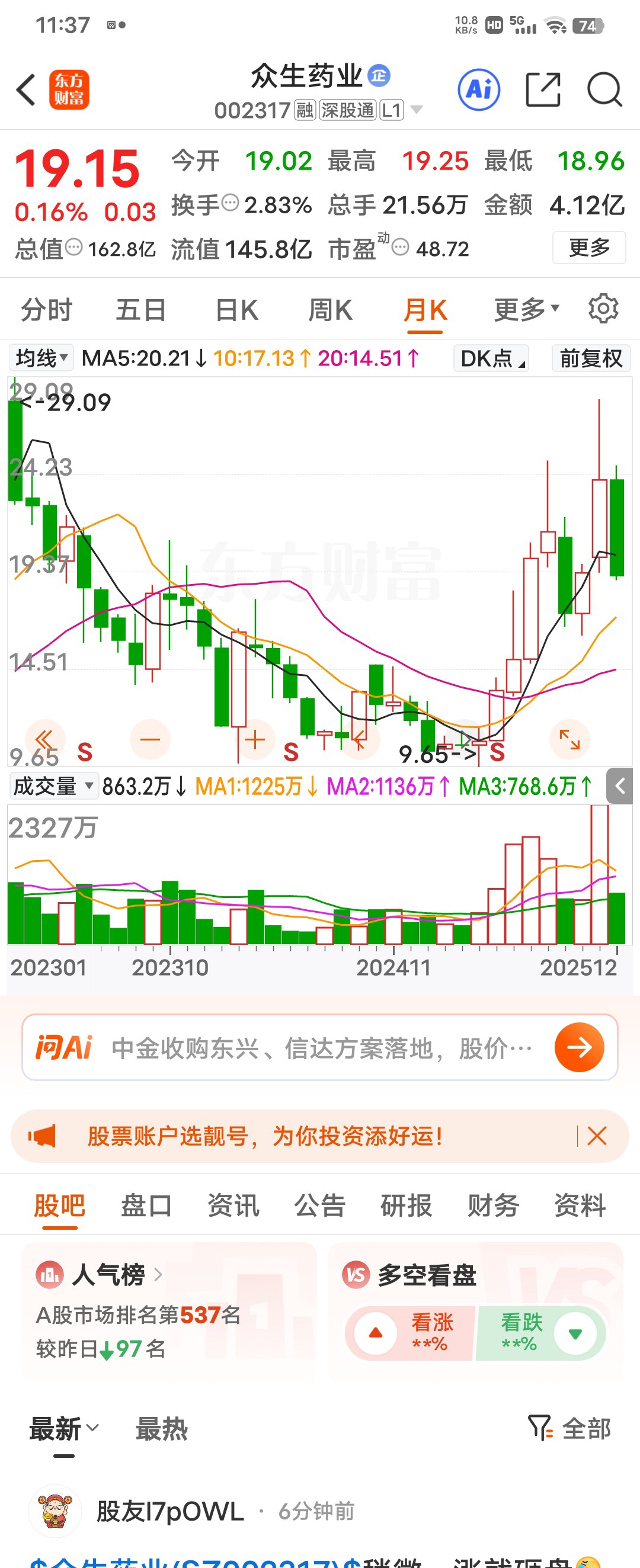 $众生药业(SZ002317)$ 看看月线,谁还说调整的大,才调整不到一个月好不好,年初到年尾还接近翻倍,跌到十六很正常,跌到十块长线投资也没亏钱
