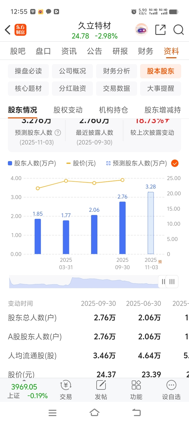 $久立特材(SZ002318)$ 订证一下:股东增加34.16%,是截止到9月30日;到11月3日股东约3.28万,比6月30的2.06万增加约59.22%。此乃社保重仓,属慢牛特性;悲观的估计洗盘需1月左右、甚至2月左右