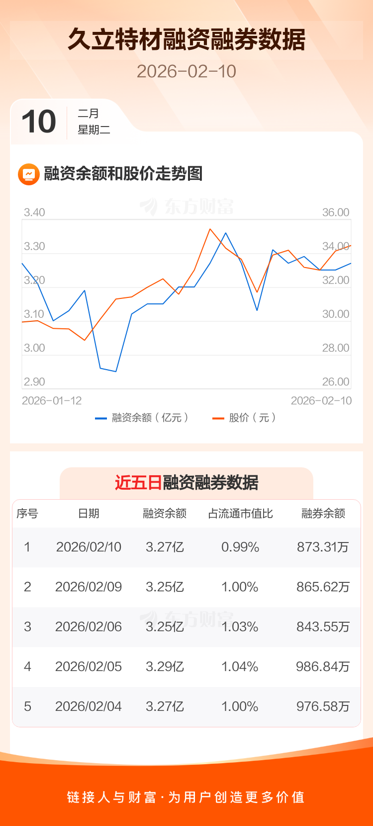 交易所最新数据显示,久立特材于2026年2月10日获融资买入2085.63万元,融资偿还1922.24万元,当日融资净买入163.39万元。目前,该股融资余额3.27亿,占流通市值比例为0.99%。