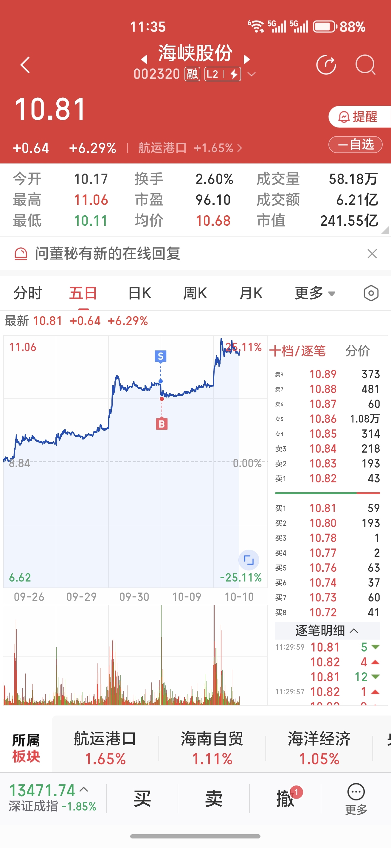 $海峡股份(SZ002320)$ 小峡加油!一直都相信你就是龙头还好昨天9.93把国庆前10.2卖的一点点接回来了