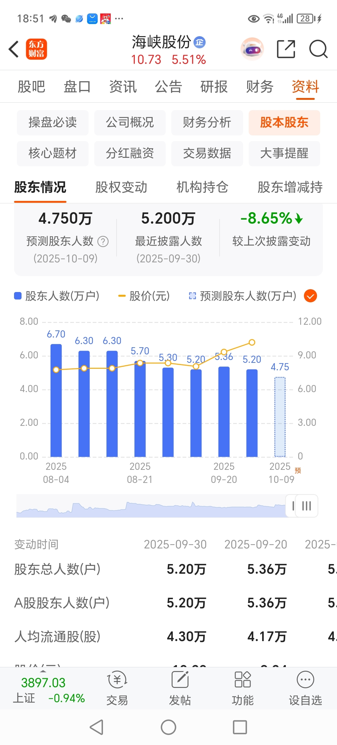 $海峡股份(SZ002320)$ 海峡来好消息了,一天之间股东人数减少10%