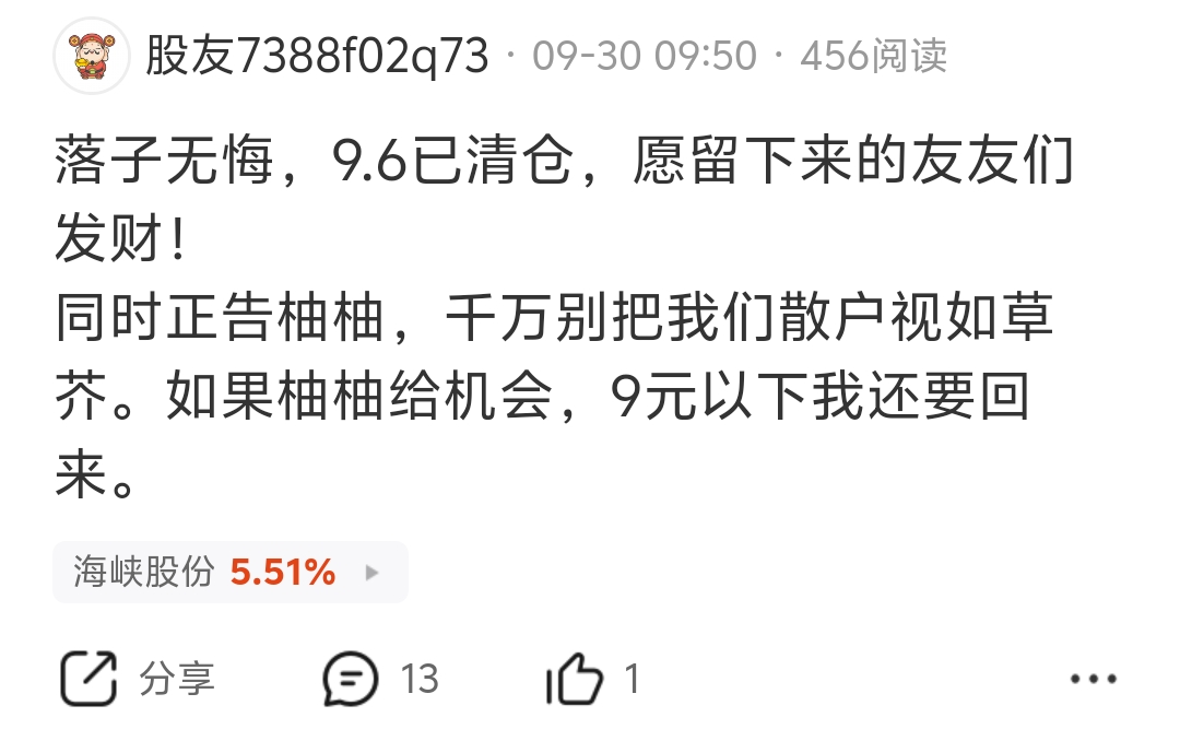 $海峡股份(SZ002320)$ @股友7388f02q73 小见韭继续删贴呀!的玩意。前两天卖飞了,幻想着能接回来,就装个碧装大度嚎一声落子无悔。现在海峡又大涨,这贵州见韭菜苟急了,也了,也不祝福了,在这里喷使加嚎暴跌。穷地方的穷见韭菜,哈哈哈哈