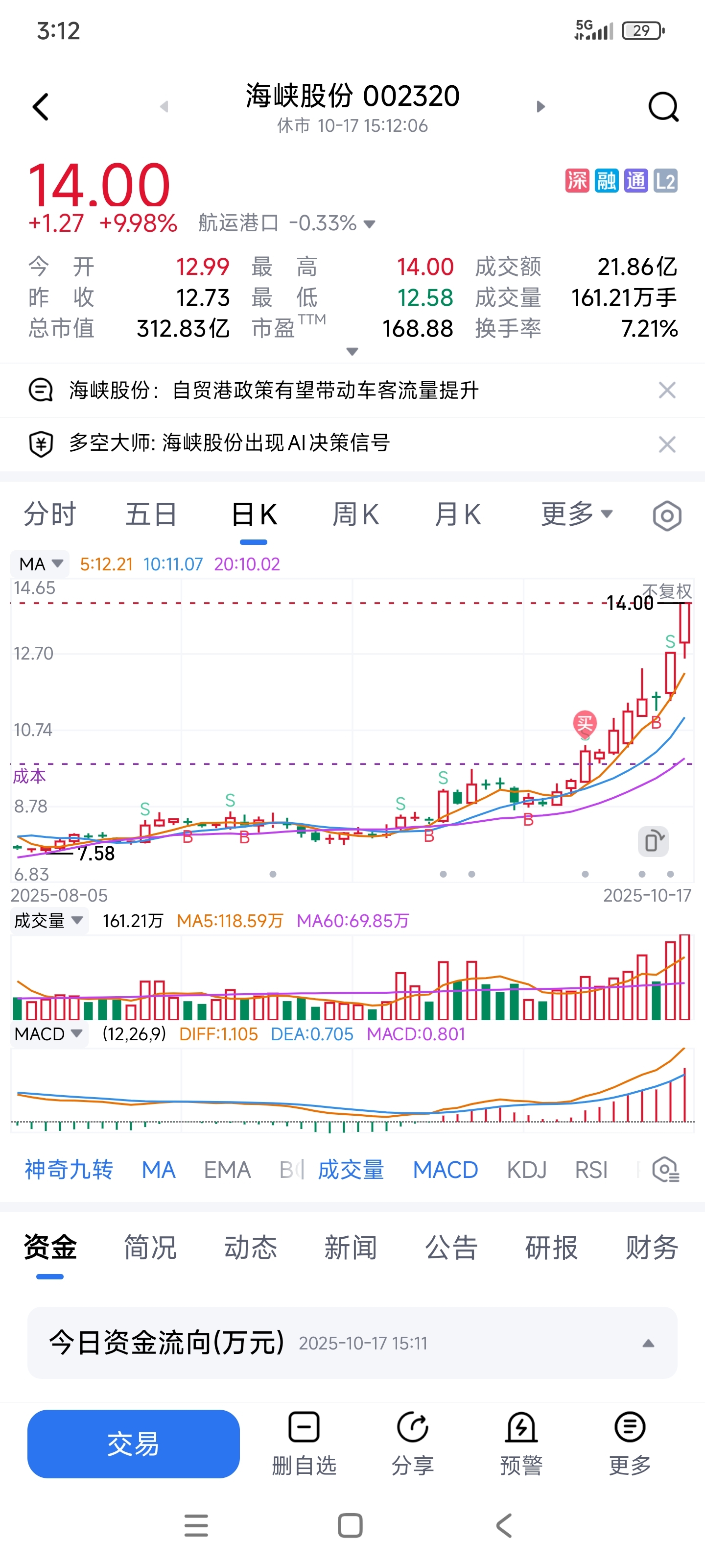 $海峡股份(SZ002320)$ 年底能不能过个肥年?看你啦主力,我今年能不能提前放假就看你的啦主力