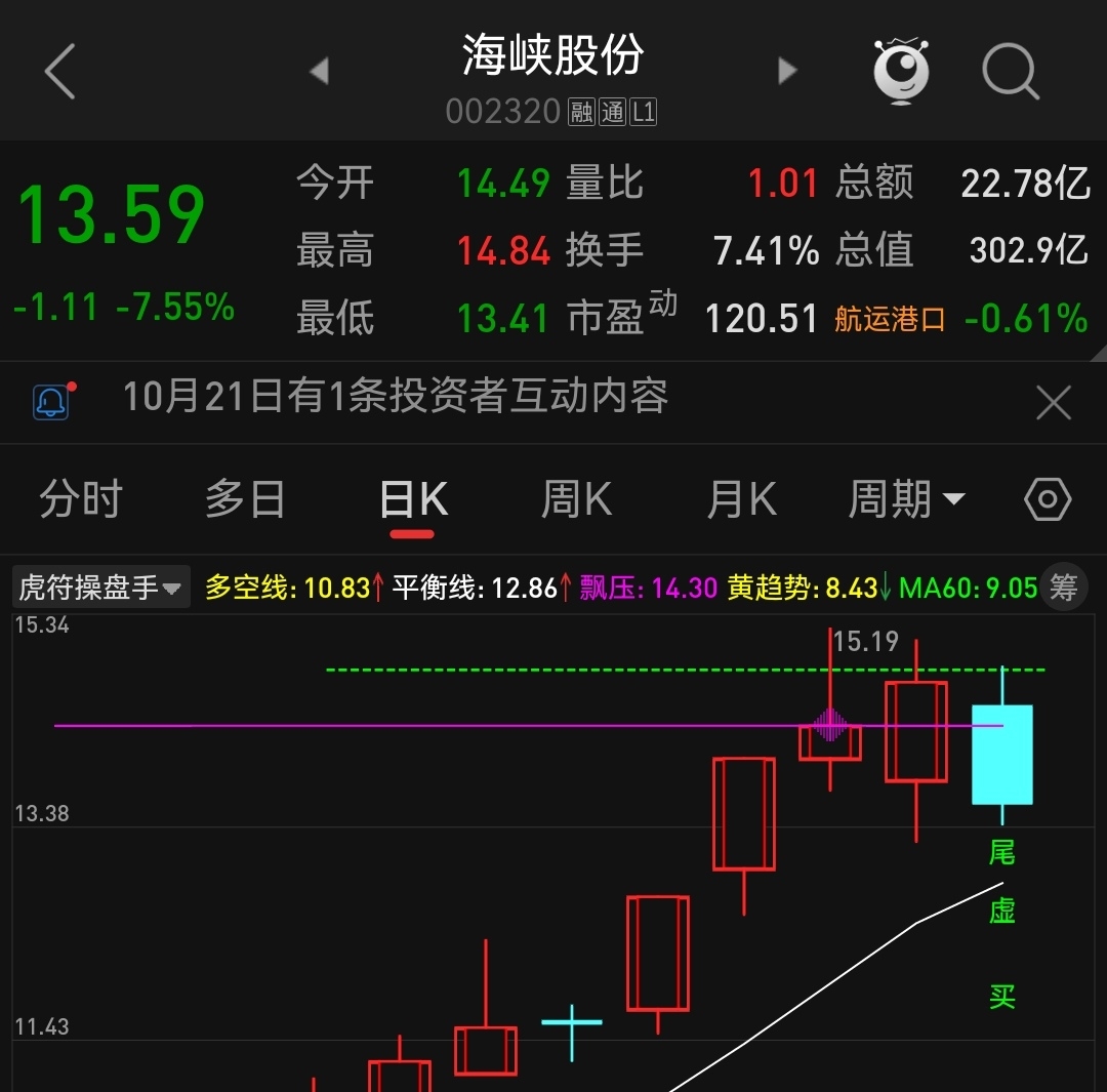 今天早盘上证指数下跌了25个点,但是砸出了下跌70个点的感觉,不过呢,海峡股份可以放心,后面这几天,还会有14元以上的机会