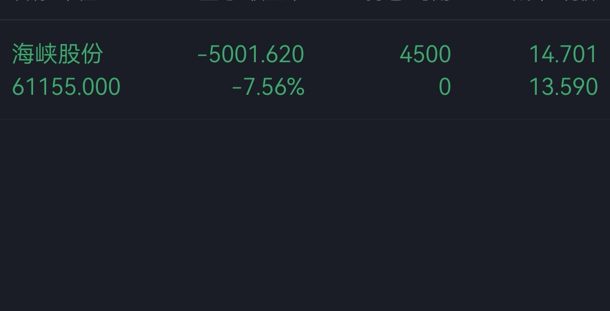 $海峡股份(SZ002320)$ 只能说有点无语,怎么也没想到会跌这么多,只能明天补仓了,慢慢熬