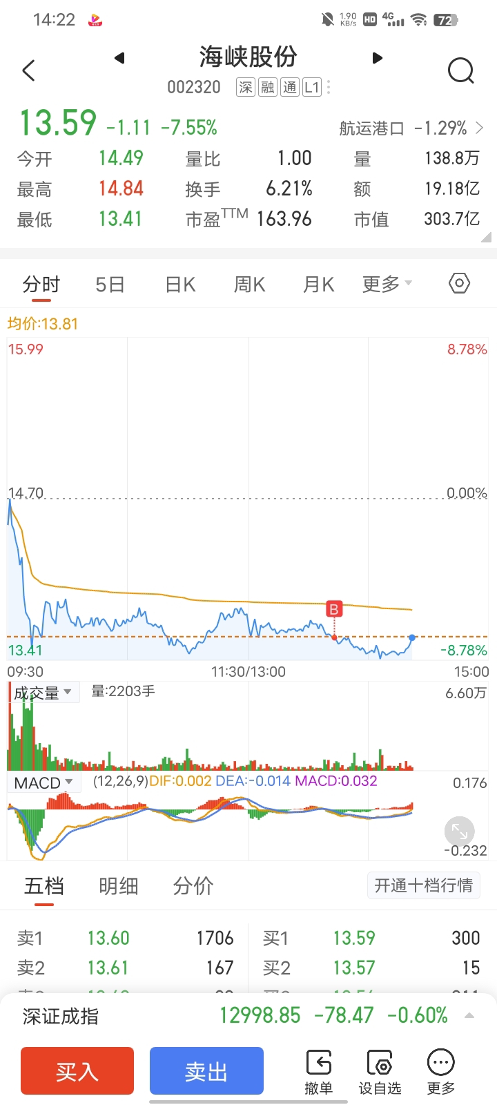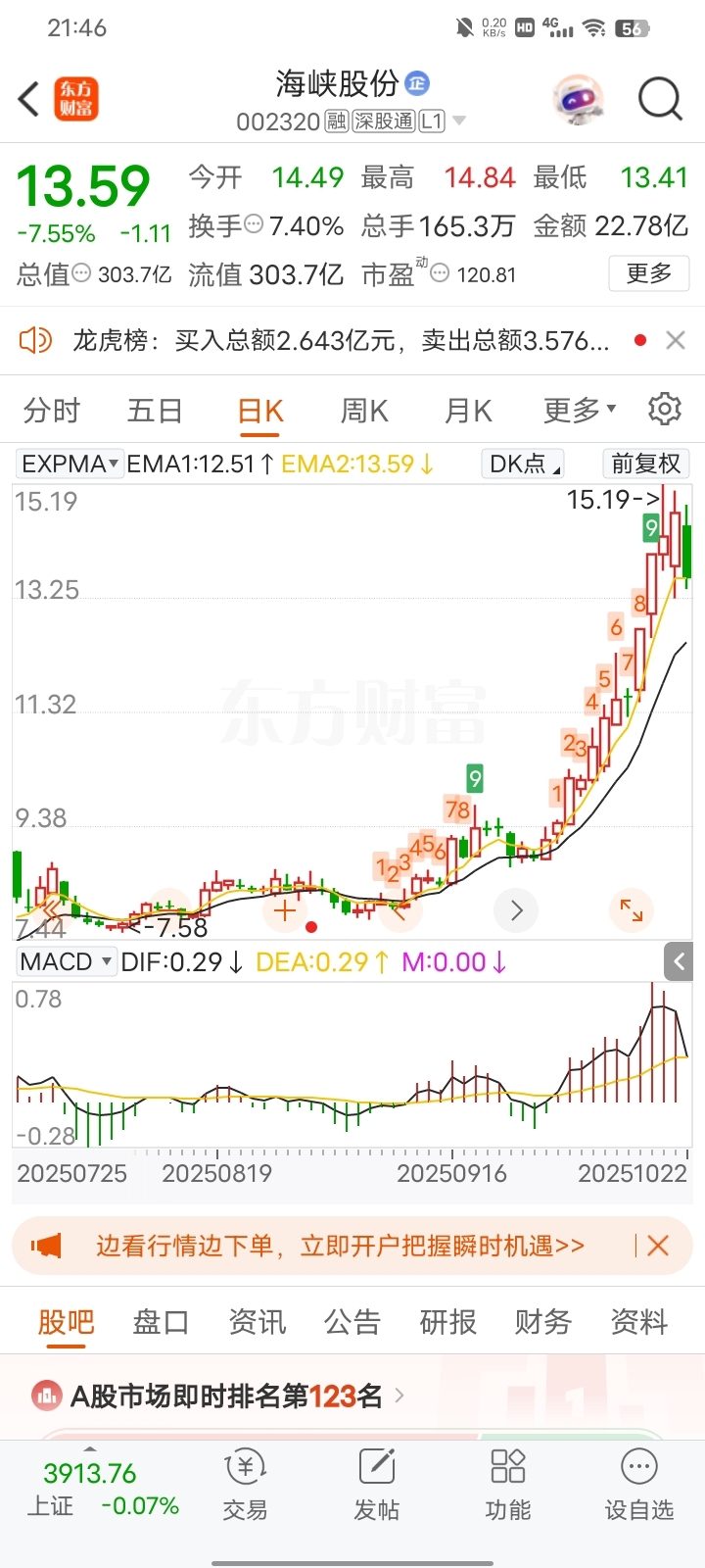 $海峡股份(SZ002320)$ 按指标买入13.59(周期多头线上,明日破了认栽)
