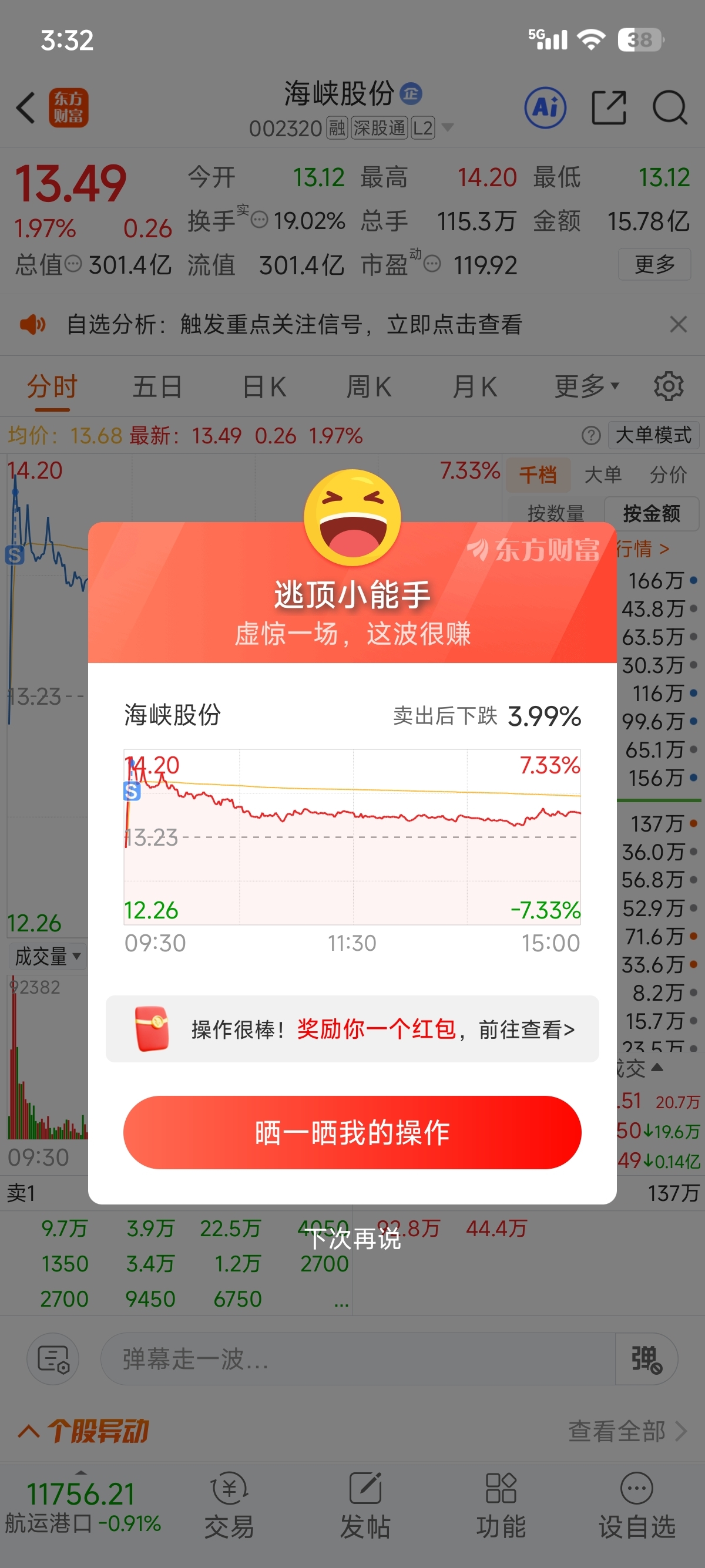 $海峡股份(SZ002320)$ 这股的趋势还没走完的,找机会买回来。