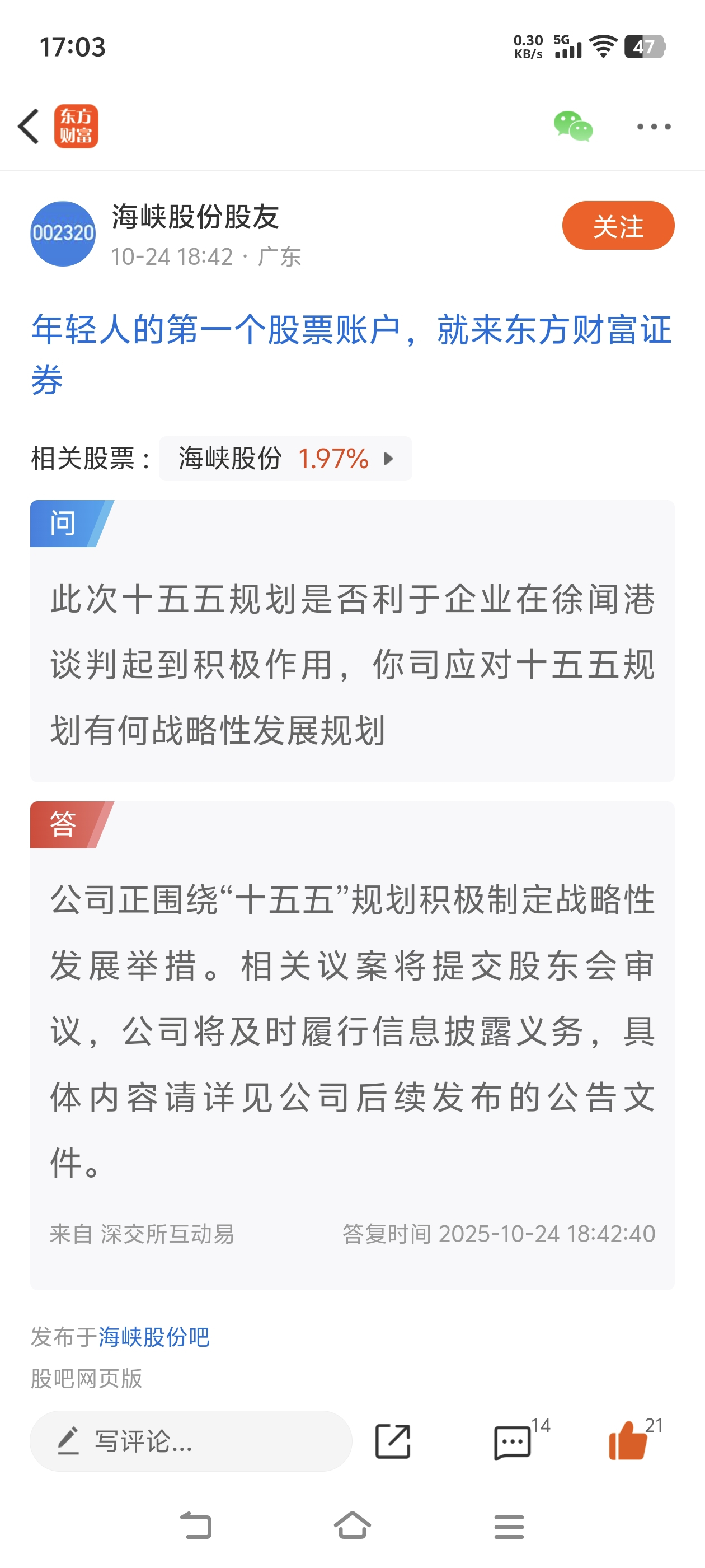 $海峡股份(SZ002320)$