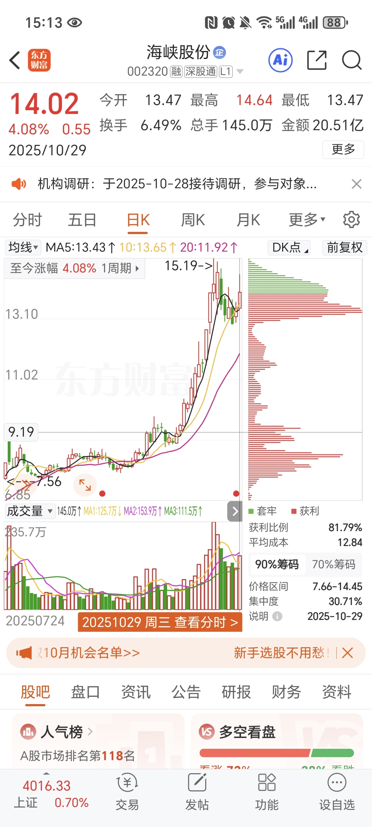 $海峡股份(SZ002320)$ 这里显示平均成本12.84,越来越高了。还是老庄熟悉的味道,高度控盘。今天海南板块集体爆发,希望明天继续,收回15放出套牢盘