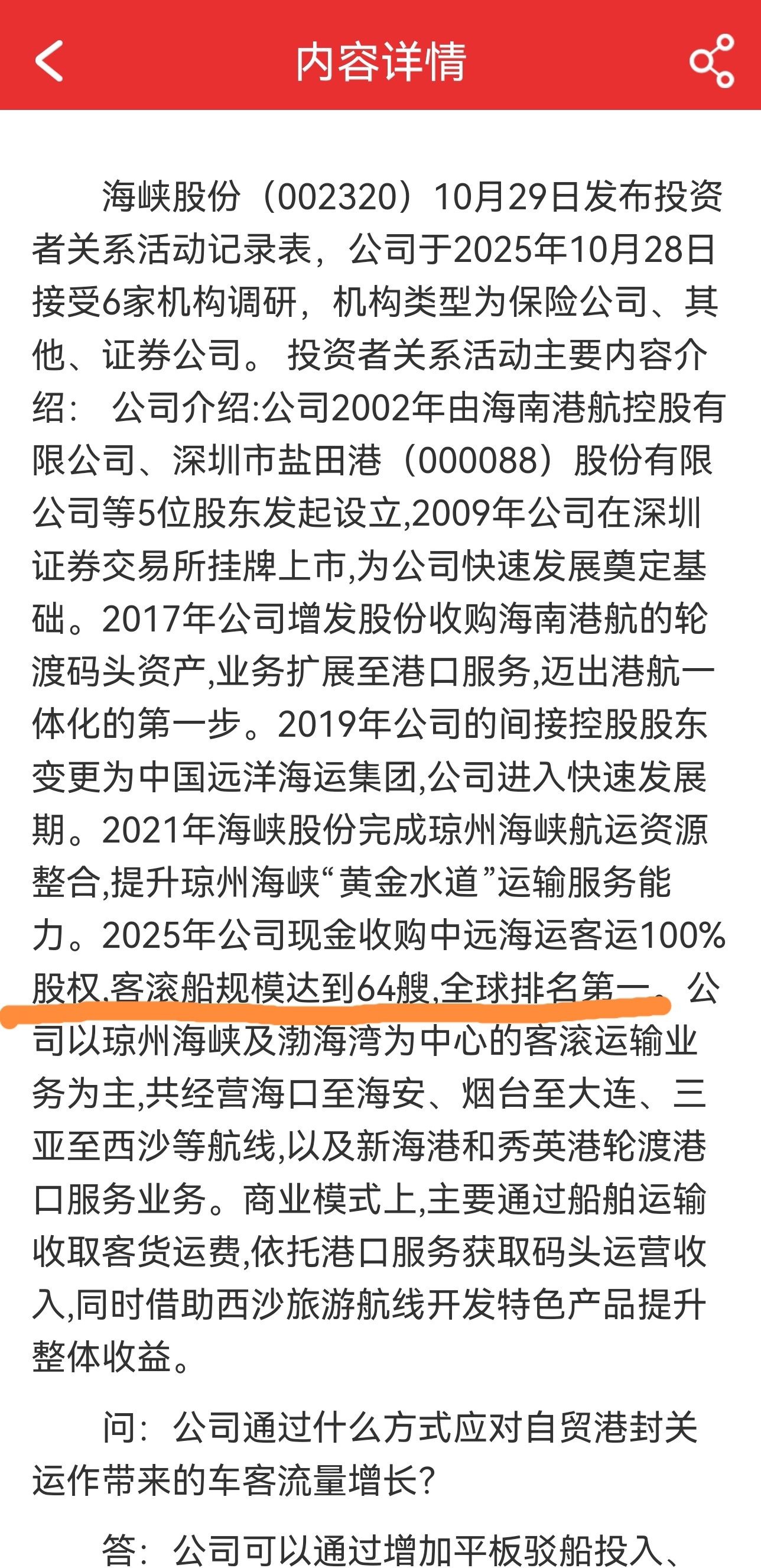 $海峡股份(SZ002320)$ 之前说过它的客滚船规模全球第一吧,没人信。机构调研了