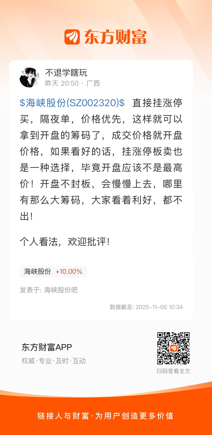 温馨提示: 1.根据《证券法》规定,禁止编造、传播虚假信息或者误导性信息,扰乱证券市场;2.用户在本社区发表的所有资料、言论等仅代表个人观点,与本网站立场无关,不对您构成任何投资建议。用户应基于自己的独立判断,自行决定证券投资并承担相应风险。《东方财富社区管理规定》