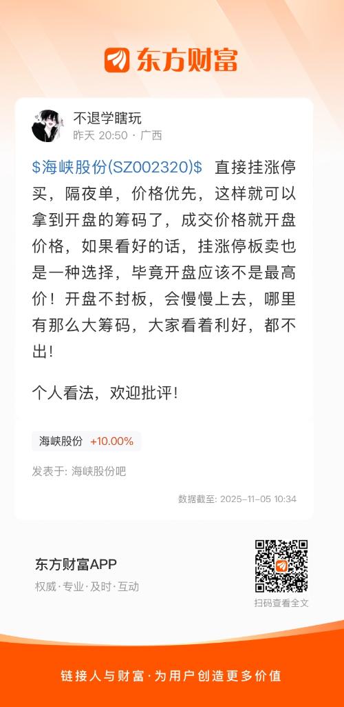$海峡股份(SZ002320)$ 直接挂涨停买,隔夜单,价格优先,这样就可以拿到开盘的筹码了,成交价格就开盘价格,如果看好的话,挂涨停板卖也是一种选择,毕竟开盘应该不是最高价!开盘不封板,会慢慢上去,哪里有那么大筹码,大家看着利好,都不出!