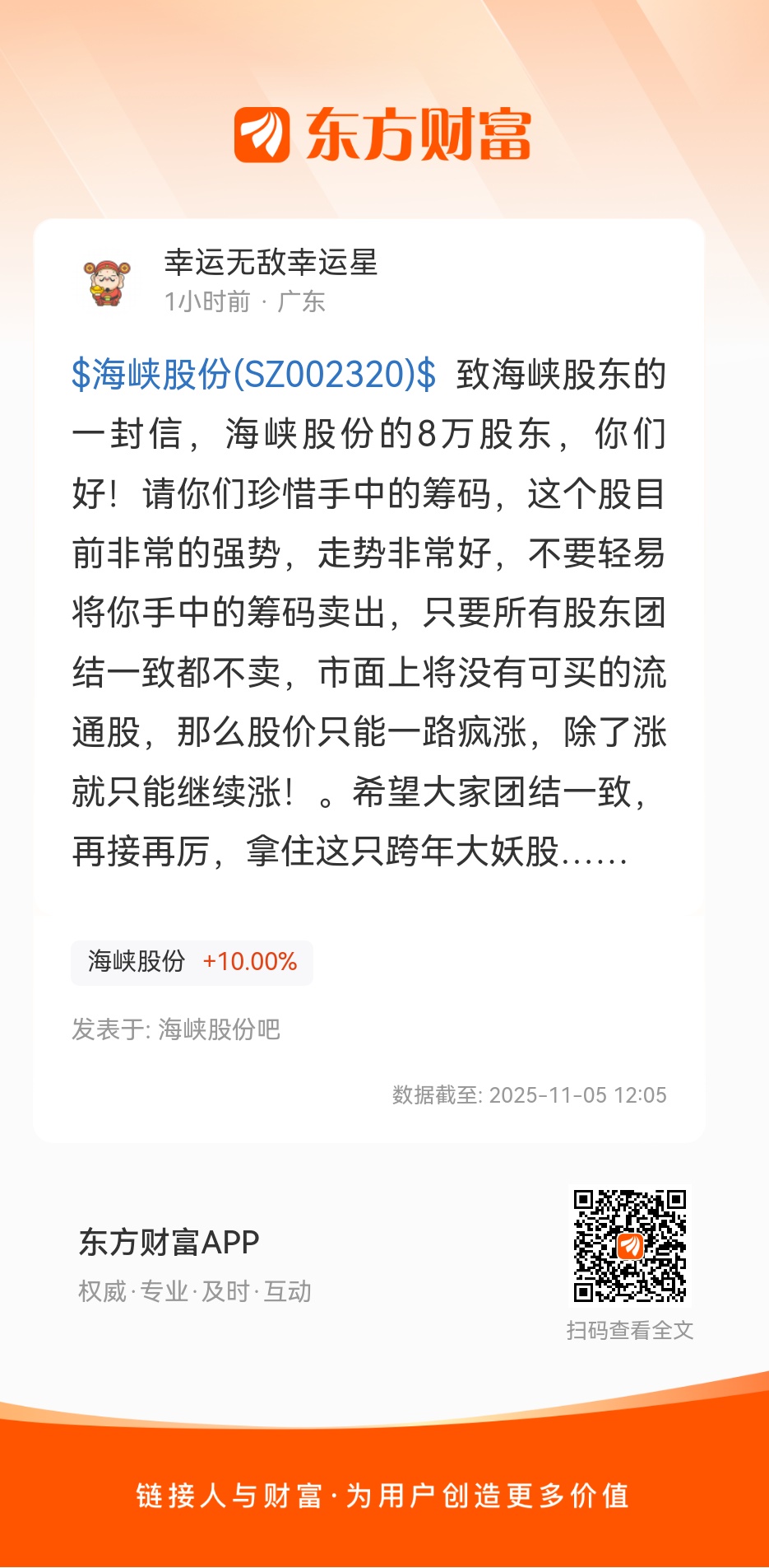 $海峡股份(SZ002320)$ 致海峡股东的一封信,海峡股份的8万股东,你们好!请你们珍惜手中的筹码,这个股目前非常的强势,走势非常好,不要轻易将你手中的筹码卖出,只要所有股东团结一致都不卖,市面上将没有可买的流通股,那么股价只能一路疯涨,除了涨就只能继续涨!。希望大家团结一致,再接再厉,拿住这只跨年大妖股……