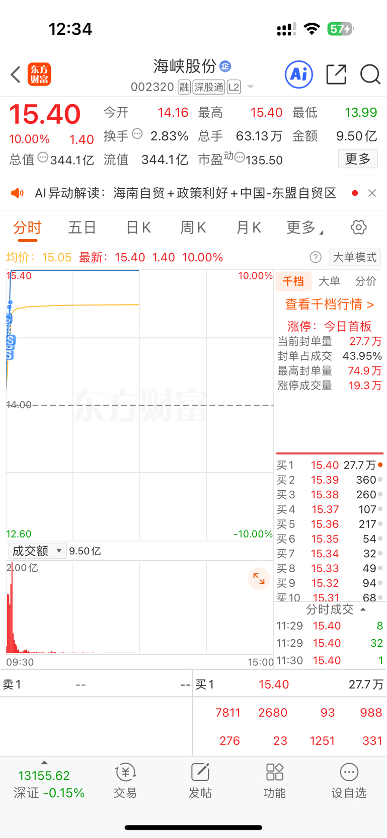 $海峡股份(SZ002320)$ 7个点卖了,卖飞了,兄弟们,在里面的继续吃肉