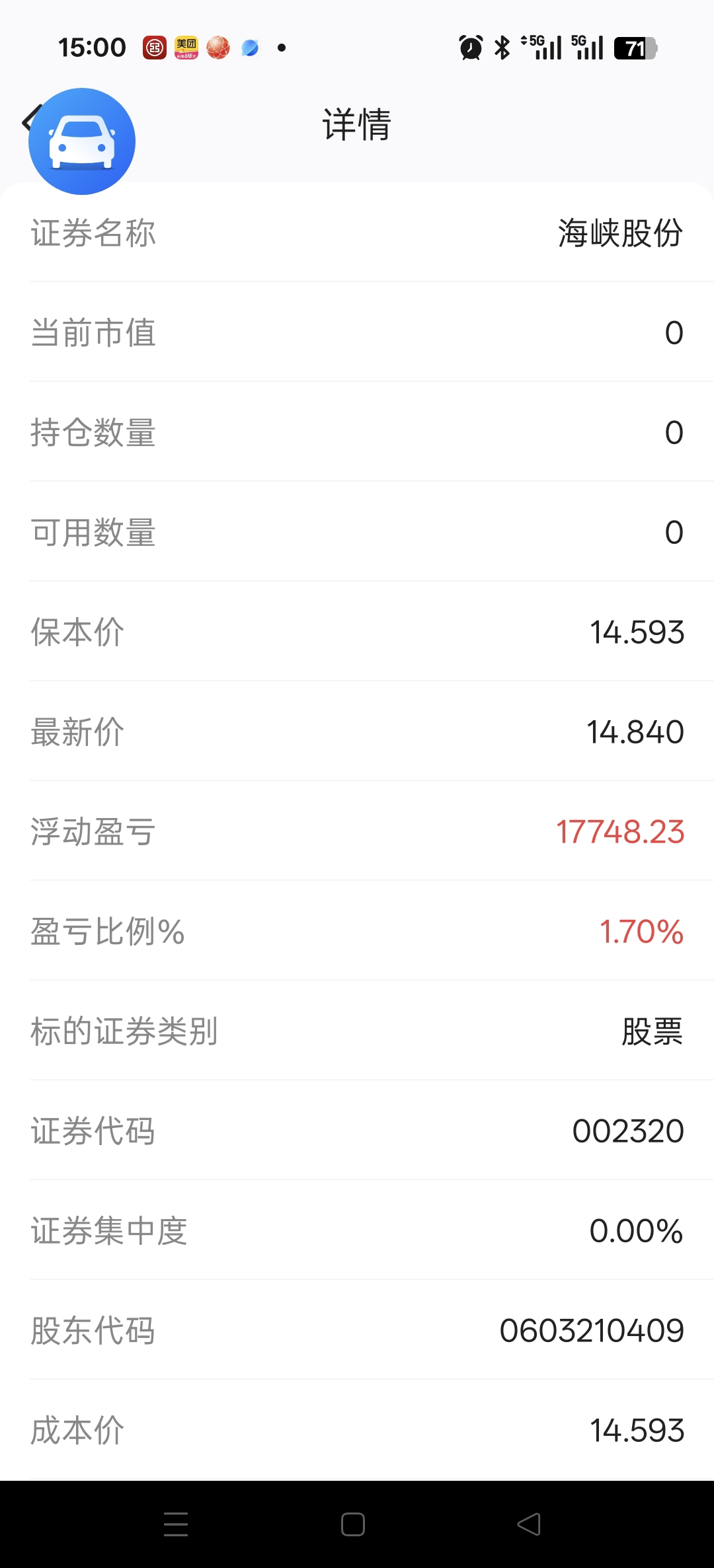 $海峡股份(SZ002320)$ 已清仓。